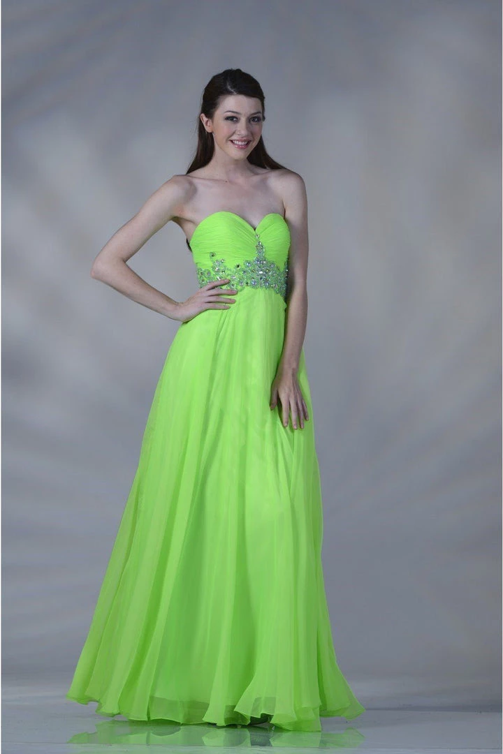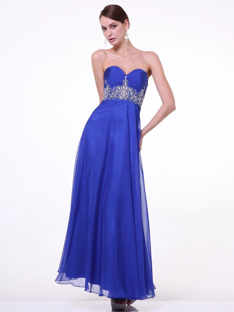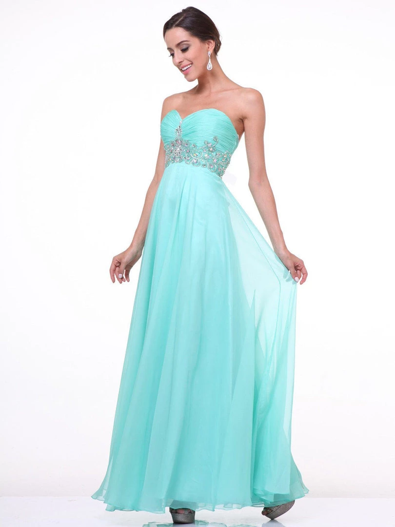 Turn heads in this sweetheart strapless gown with beaded top by Cinderella Divine 7664. Sparkling bead and jewel detail the sweetheart shirred bodice and the empire waist. Chiffon overlay floor length long skirt completed the look.