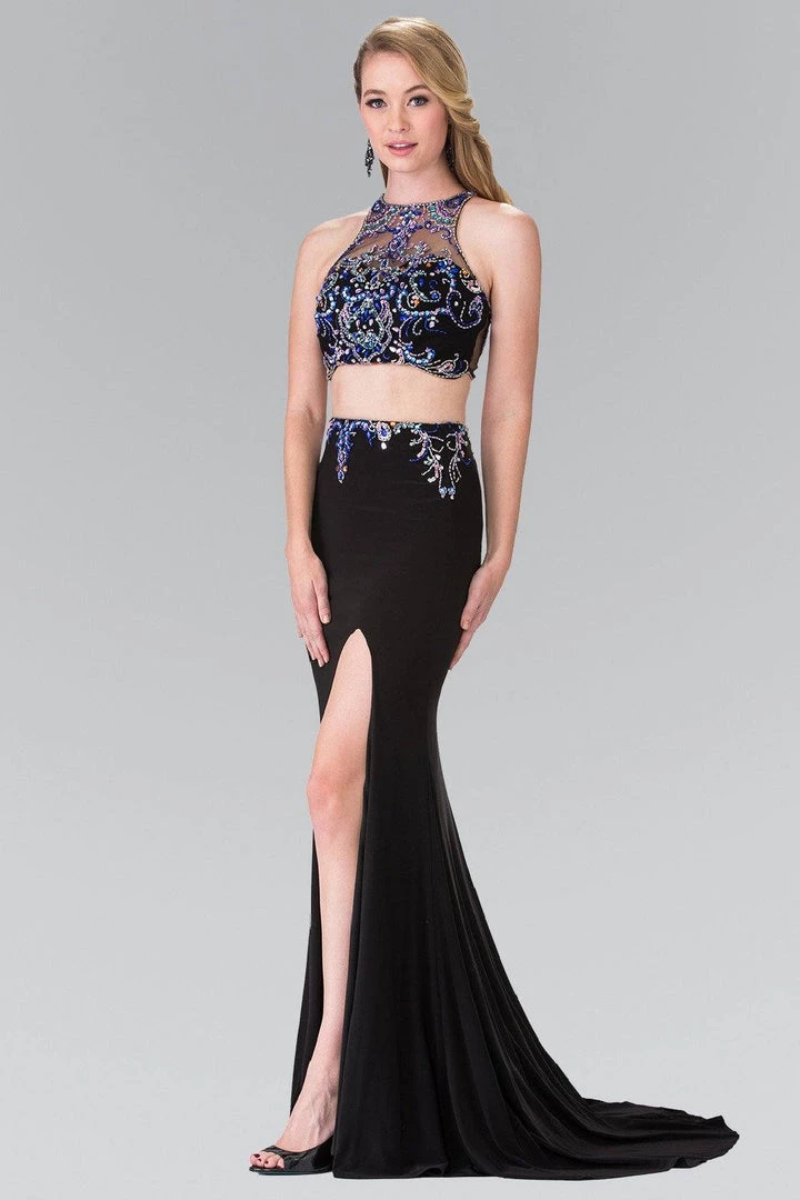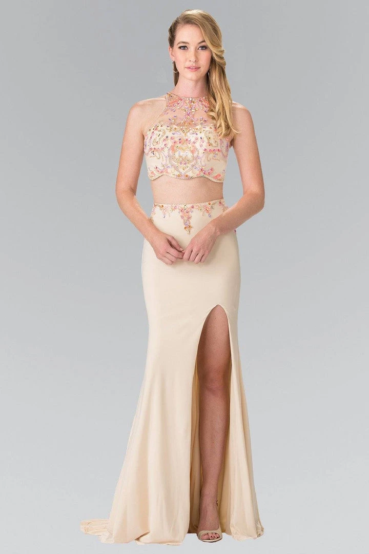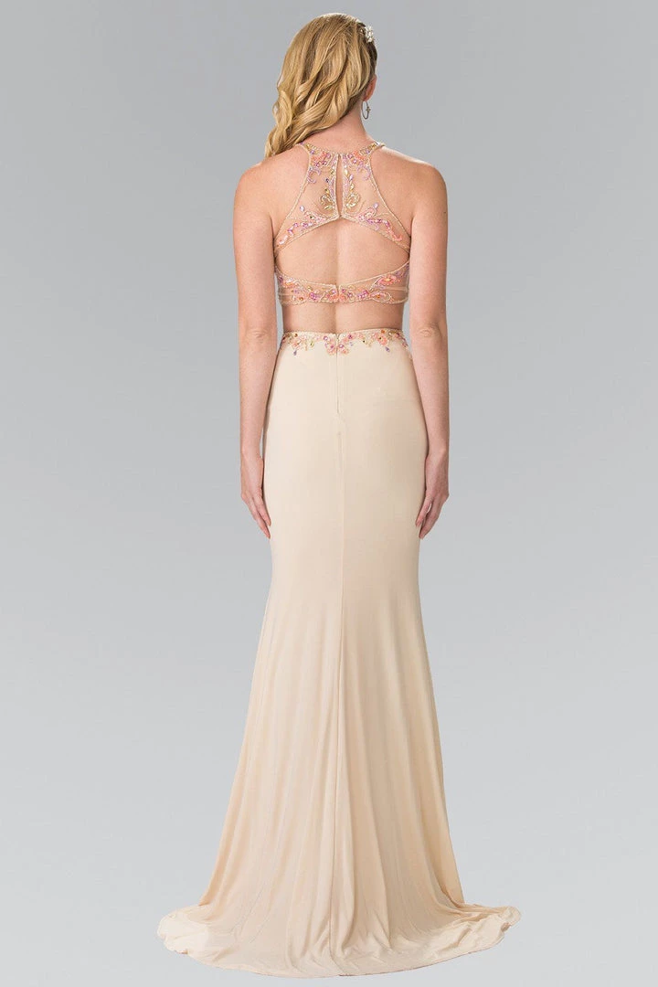 Fall in love with this beaded two piece halter illusion dress with slit by Elizabeth K.