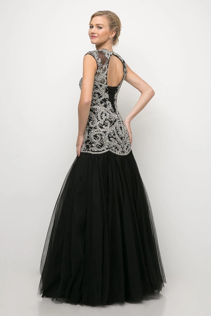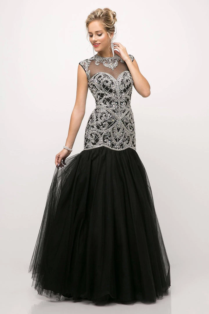 Dazzle the room in this beaded black mermaid dress with tulle skirt by Cinderella Divine UM072.