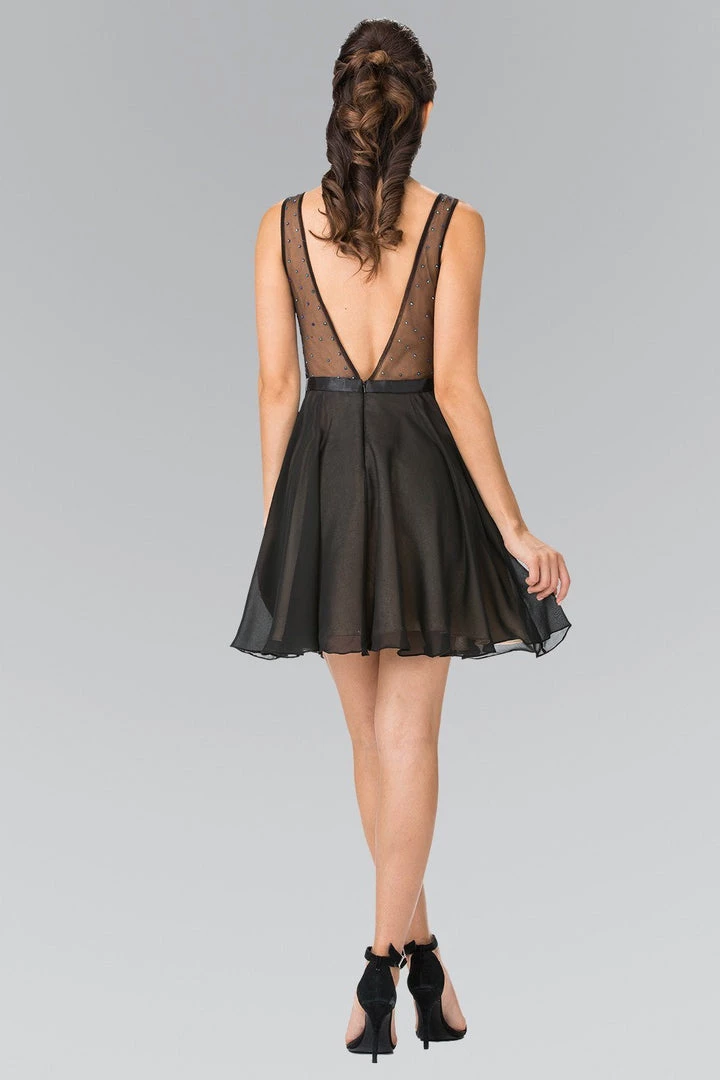 Fall in love with this short black sleeveless illusion dress with beaded lace top by Elizabeth K.