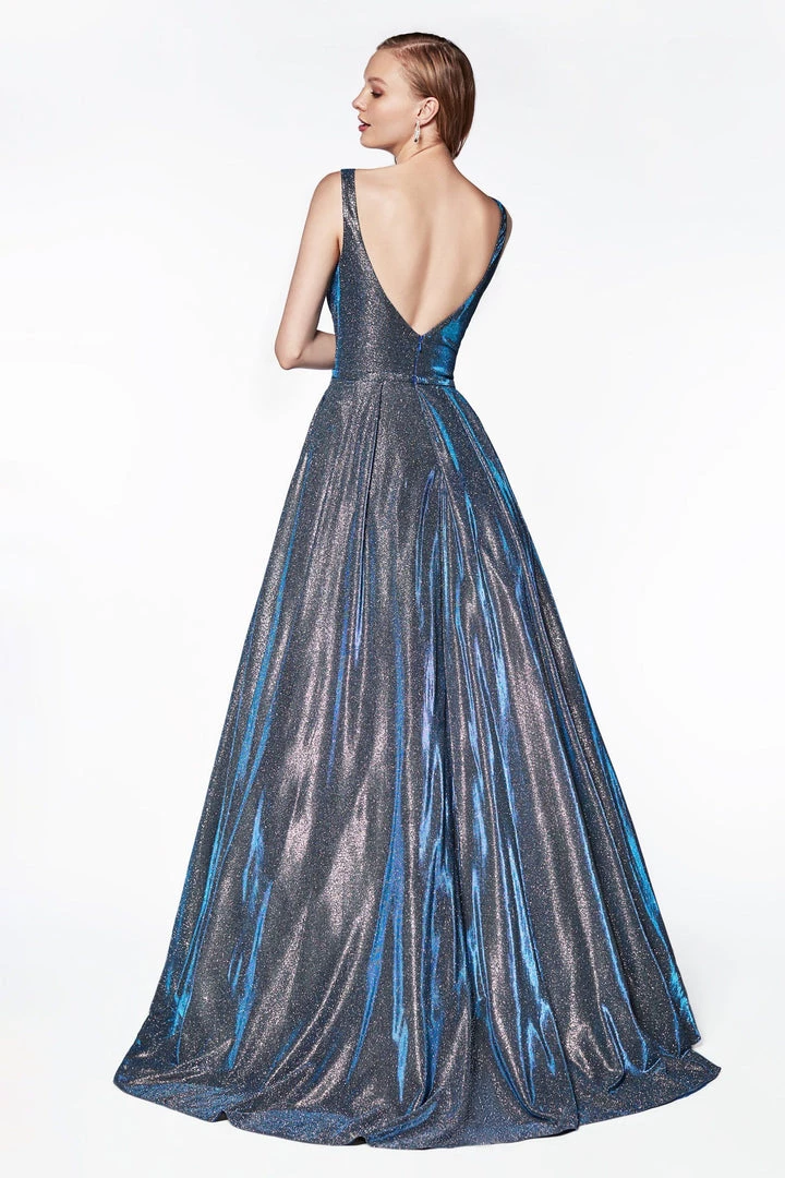 Enjoy your night out in this blue and gray long glitter iridescent A-line dress with open V-back by Cinderella Divine CB0034. We love this glittered ball gown with deep V-neckline and side pockets!