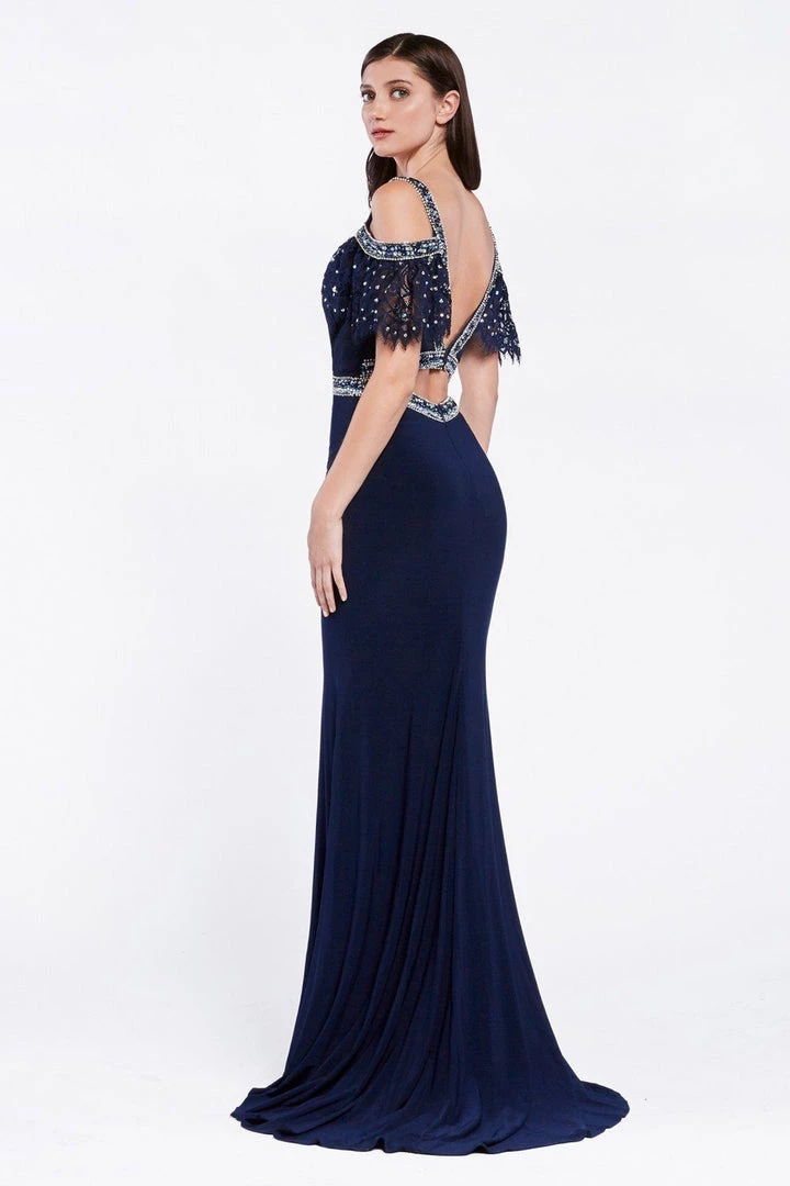 Look unforgettable in this fitted long cold shoulder mermaid dress with open back by Cinderella Divine 13119.