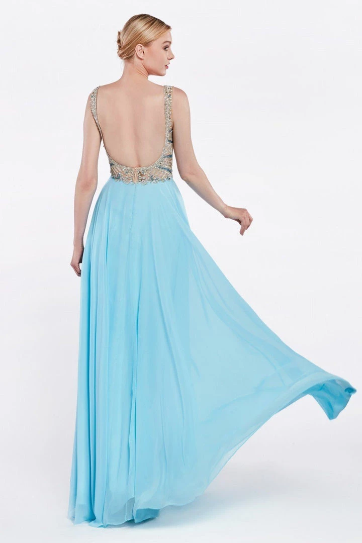 Make a grand entrance in this sky blue beaded long V-neck dress with A-line skirt by Cinderella Divine 71190.