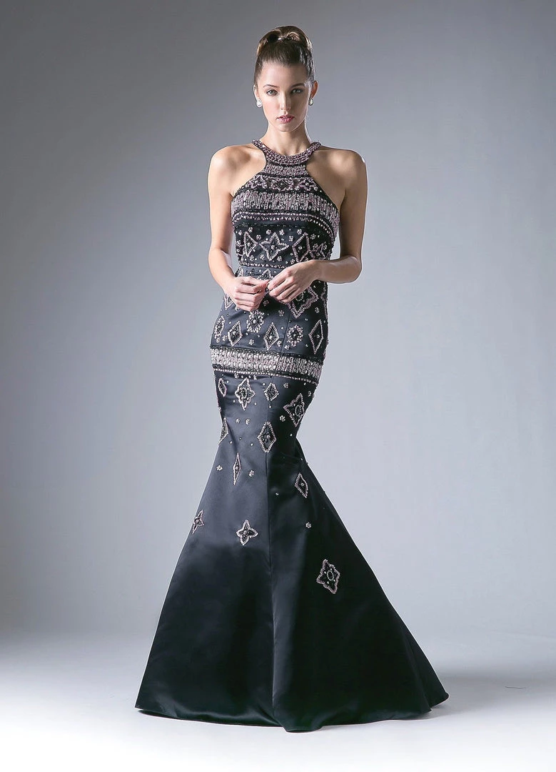 - Fitted mermaid gown with beaded embellishments and halter neckline