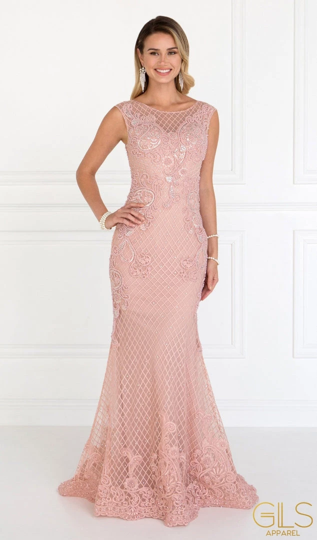 Be picture-ready in this dusty rose long floral embroidered mermaid dress by Elizabeth K GL1536. Sleeveless full length dress with a boat neckline and a mermaid silhouette. Has 3D floral embroidery work through out the dress and beaded jewel detail. Perfect for any formal event!