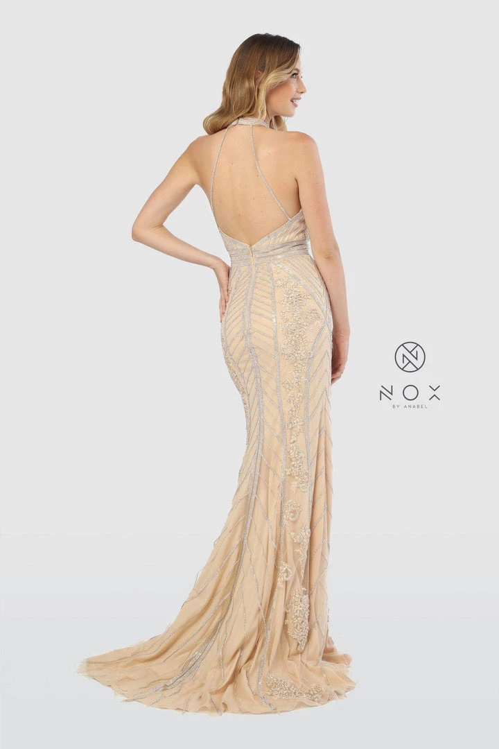 Be the center of attention in this embellished long high halter trumpet dress with open back by Nox Anabel T260.