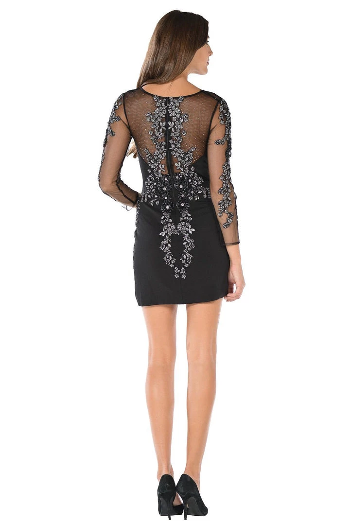 Look flirty and unforgettable in this embellished short champagne party dress with illusion sleeves by Poly USA 7754. This cocktail dress features a sleeved bodice that is adorned with lovely embroidery and dazzling stones. A sheer embellished back, a short above the knee skirt, and a zipper closure complete this beautiful look. Affordably priced under $200, this dress is perfect for any formal event and will keep you on budget!