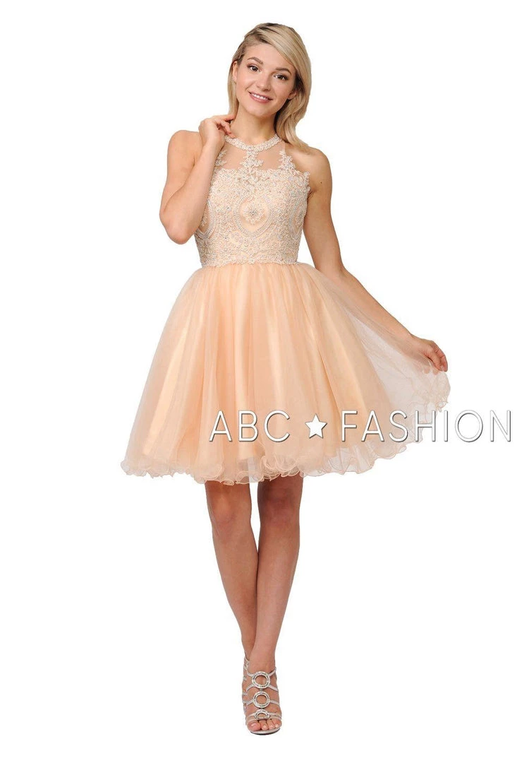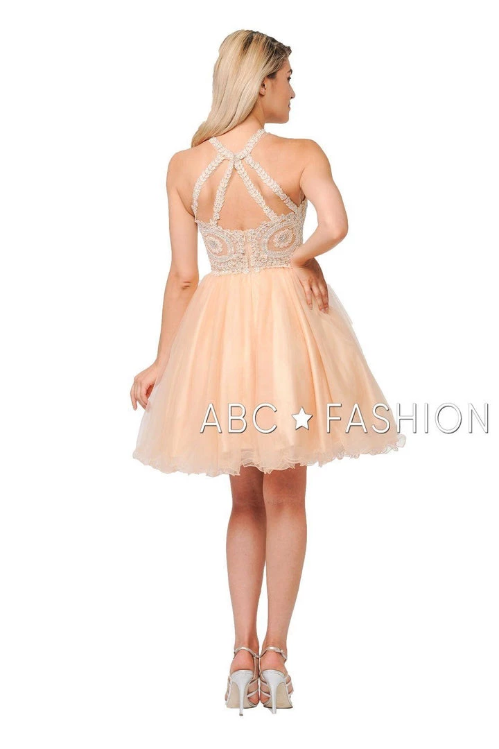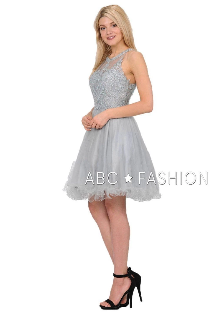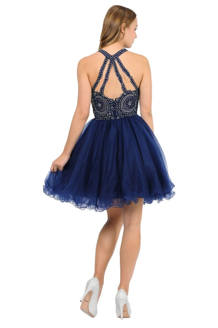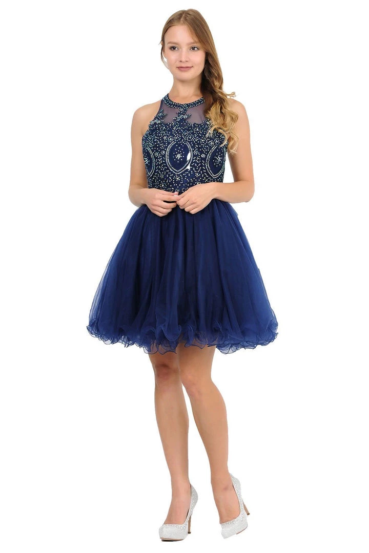 Captivate the room in this high-neck ruffled cocktail dress with embroidered applique sleeveless top by Poly USA 8308. This short party dress features a sheer sweetheart bodice, sparkly rhinestones accent the embroidered appliques, flirty open back with cut-outs, a short A-line ruffled skirt with curly hemline, and zipper closure. Affordably priced at $150, this dress is perfect for any semi-formal event and will keep you on budget!
