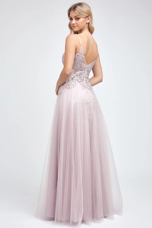 Look unforgettable in this embroidered bodice long sleeveless dress with A-line skirt by Juliet 212. This stunning dress comes with a sheered embroidered beaded bodice with open back and zipper closure.