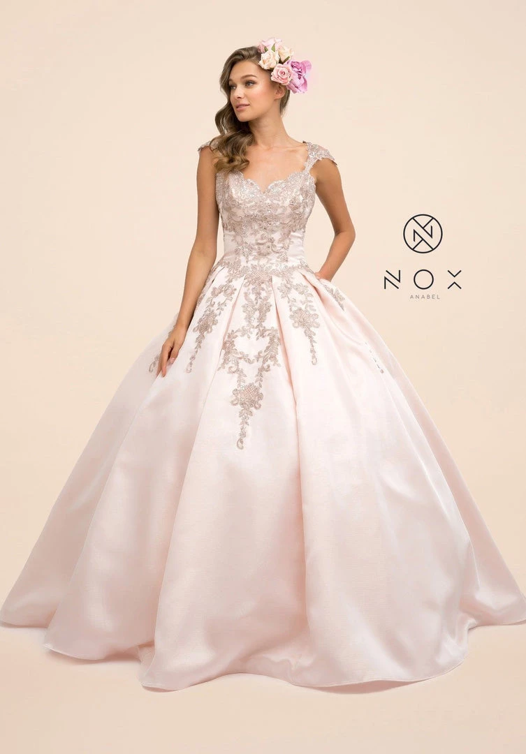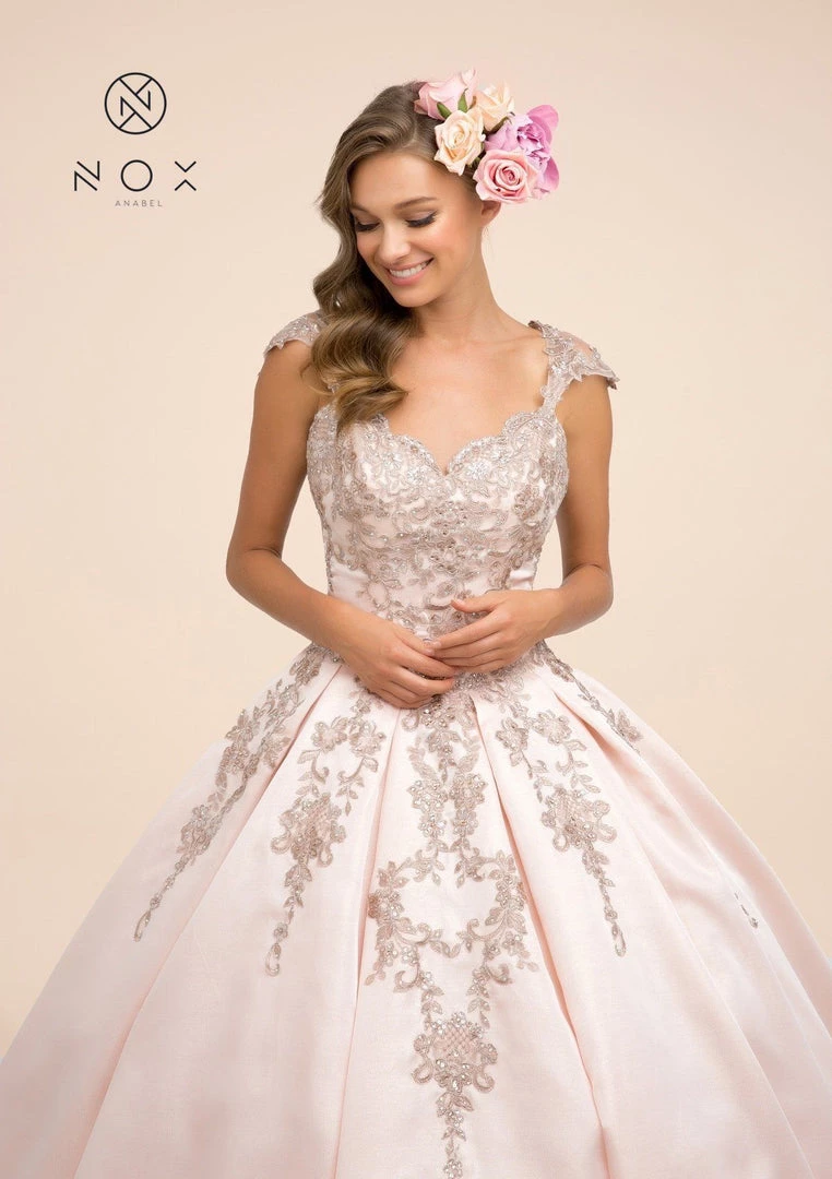 - Cap sleeve satin ball gown embroidered with beaded lace appliques
