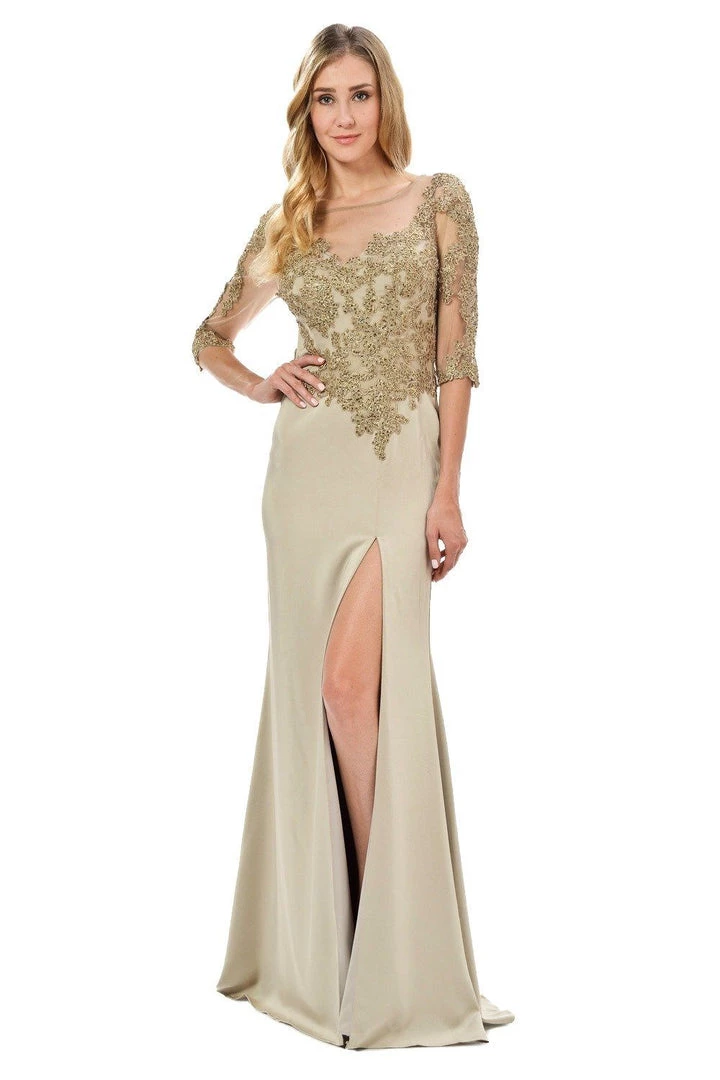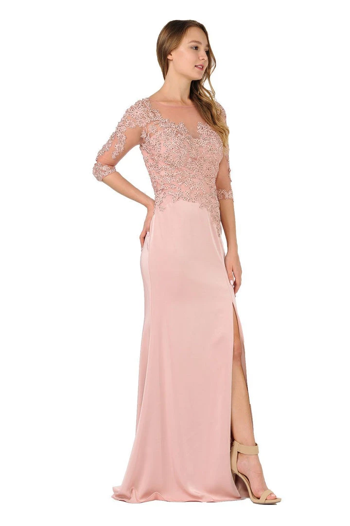 Turn heads in this embroidered mid-sleeved dress with front slit by Poly USA 7584. This beautiful formal gown features an illusion bodice adorned with floral embroidery accented with beads, sheer mid-sleeves, floor length span satin skirt with a flirty side slit, and a zipper closure.