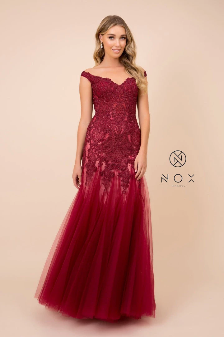 Command attention in this long fitted off the shoulder dress with beaded lace appliques by Nox Anabel J325.