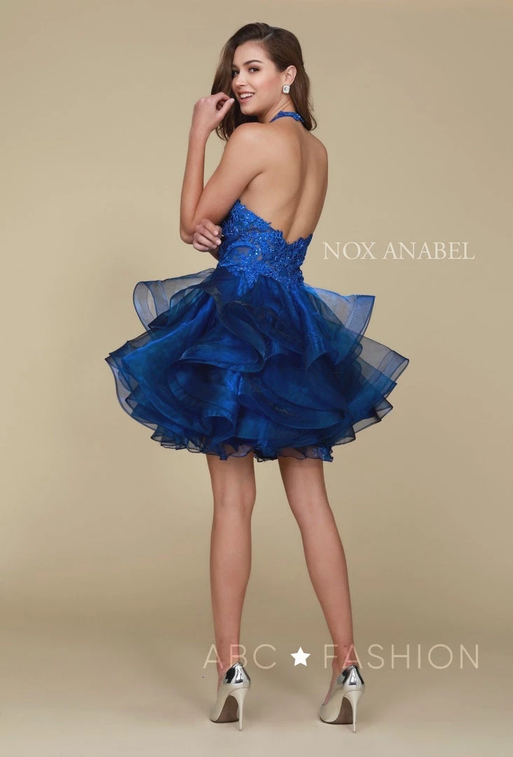 Receive lots of compliments in this embroidered bodice halter cocktail dress with tiered skirt by Nox Anabel A610. This short party dress features a high-neck halter bodice adorned with swirling floral embroidery, bra cups support the sheer illusion bodice, flirty open back, a short tiered organza skirt with horsehair hemline playfully flares out above the knees, and a zipper closure. Affordably priced under $200, this dress is perfect for any semi-formal event and will keep you on budget!