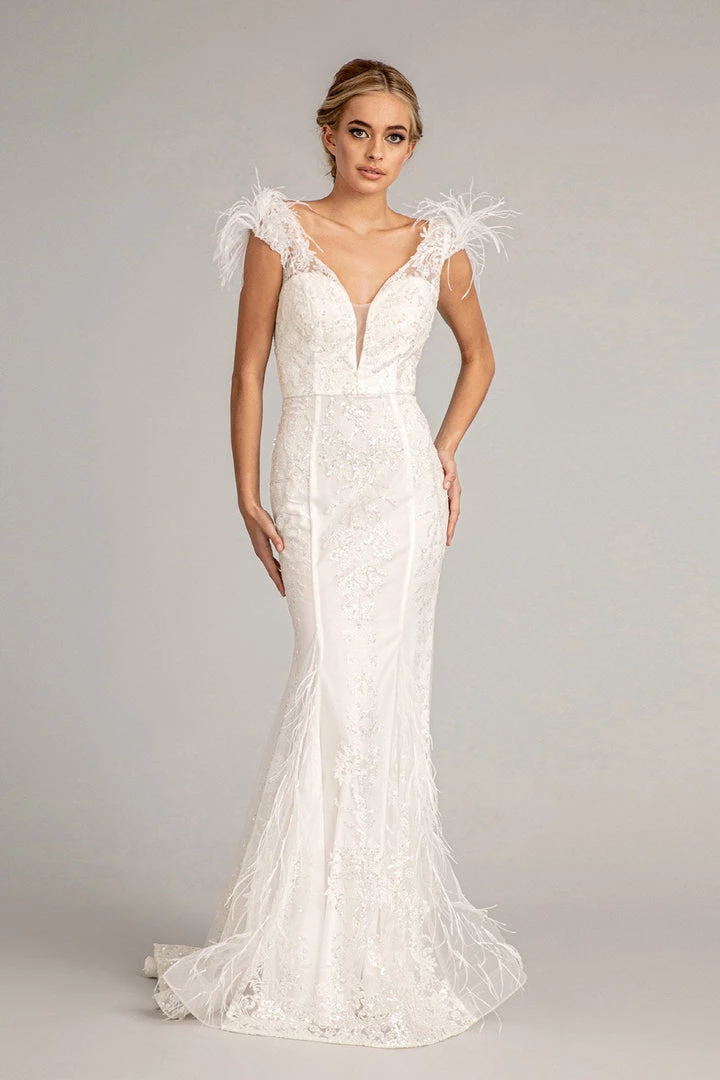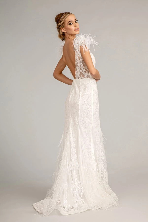 Look divine in this long feather glitter dress with fitted skirt Elizabeth K GL1983.
