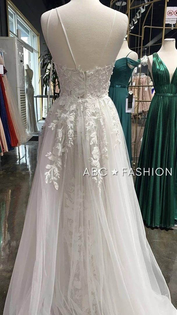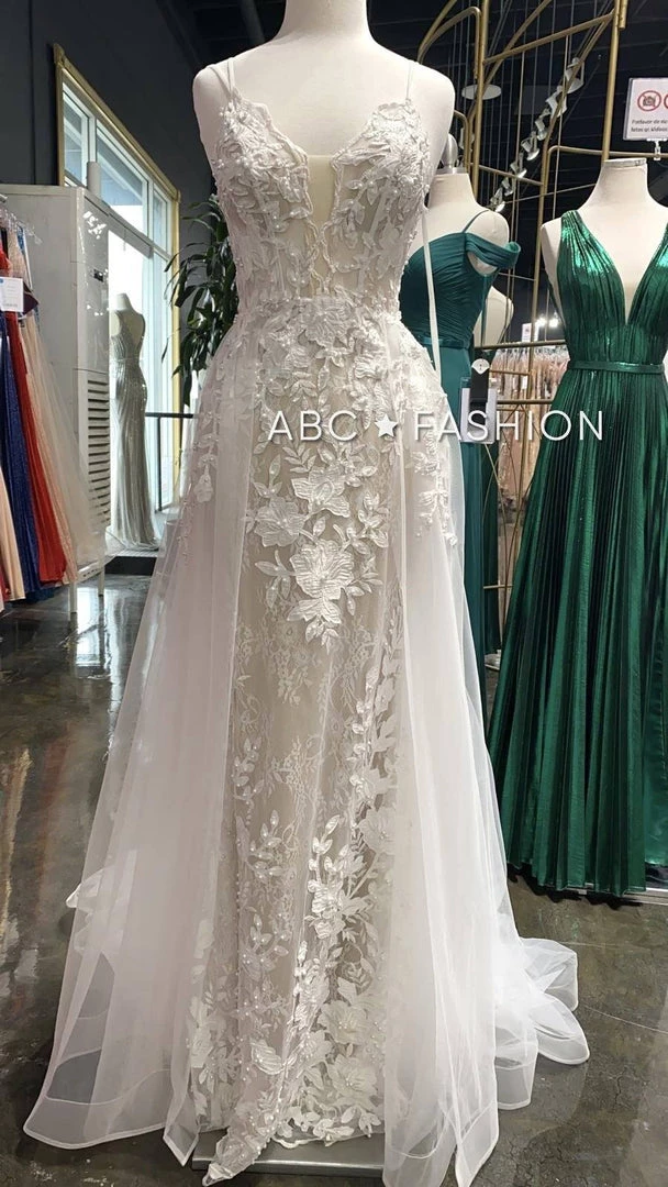 - Sleeveless fitted off-white lace gown with floral appliqués and glitter tulle overskirt