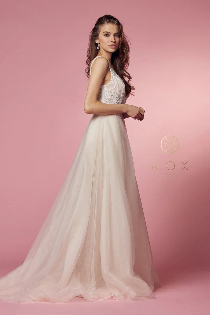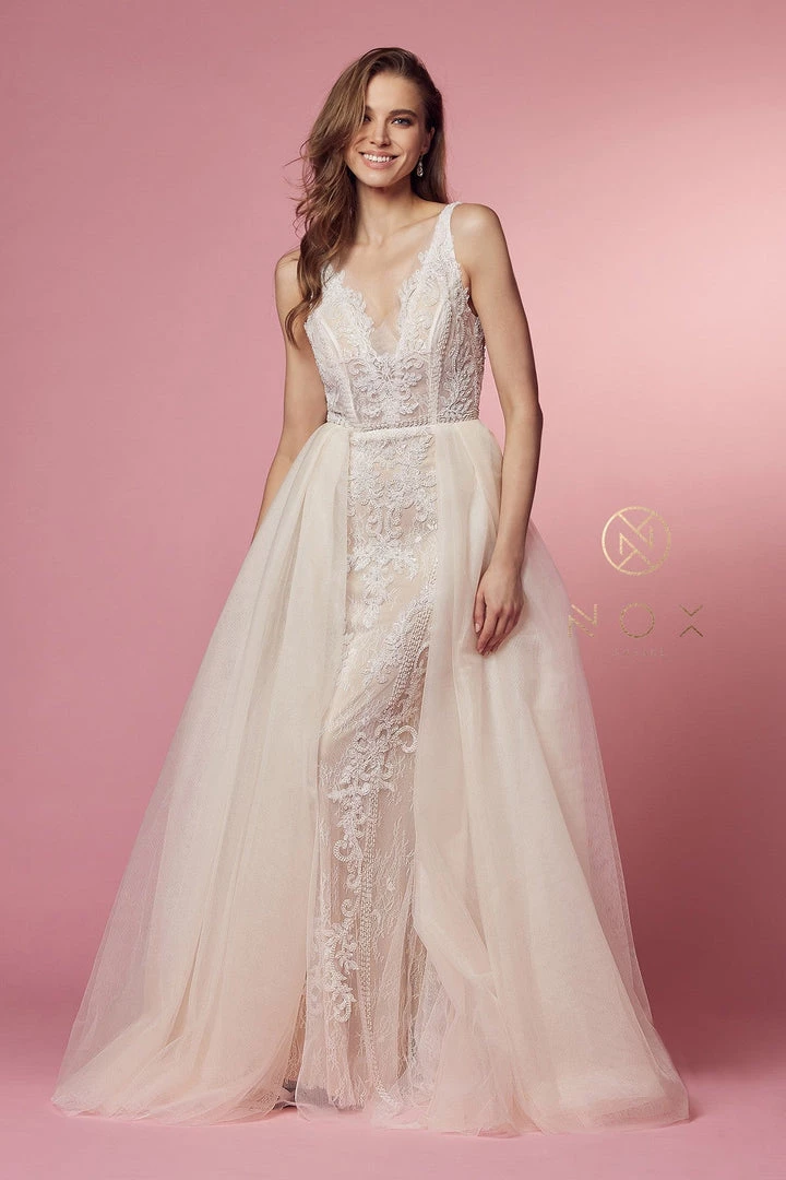 You’ll love twirling around in this floral lace long fitted V-neck dress with A-line overskirt by Nox Anabel E474. Delicate tulle with organza underlay creates a crossover feature along the bodice with ruched gathers toward the banded waist for a sheer effect and flattering texture. Beautiful floral laces are thoughtfully placed throughout the bodice and in gently curved vine-like structures throughout the skirt.