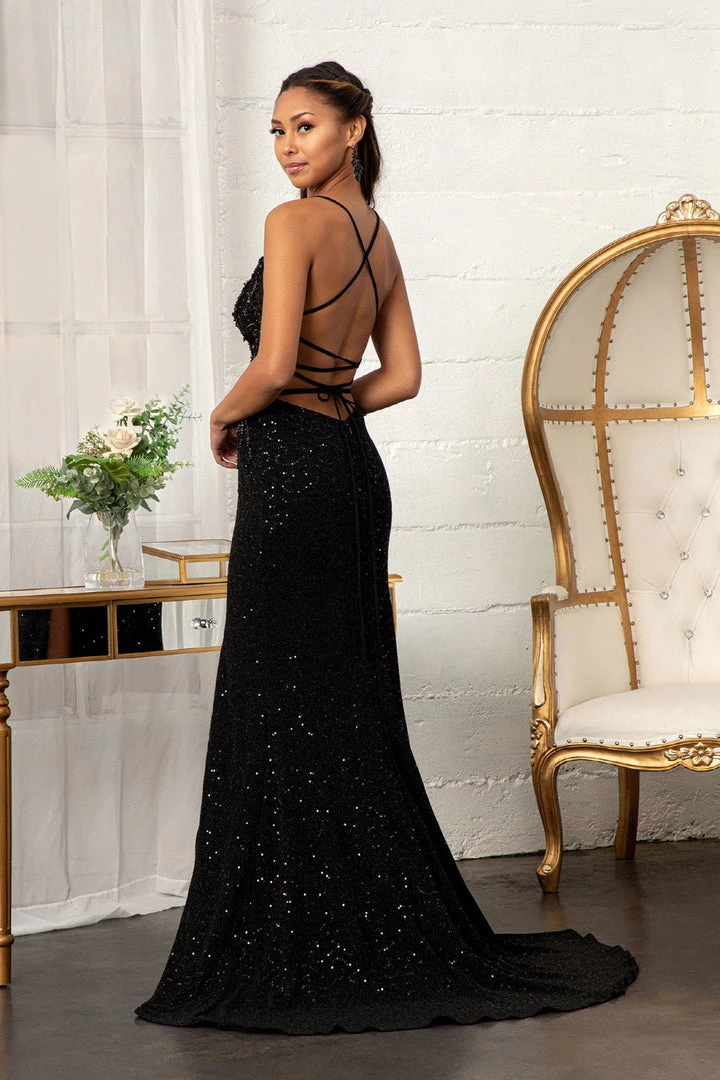 - Sheer Bodice Sleeveless V-Neck Sequin Gown with Leg Slit