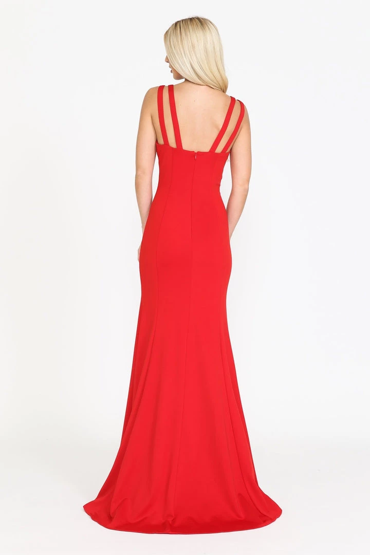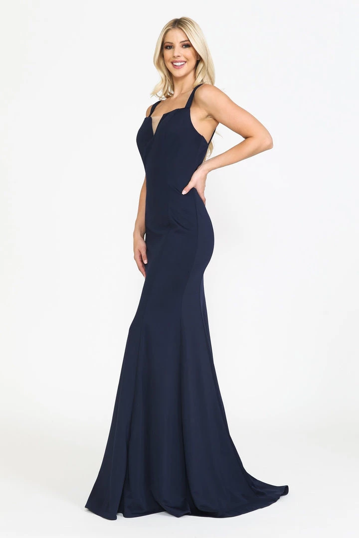 Captivate the room in this long V-neck jersey dress with fitted skirt by Poly USA 8392. This beautiful gown features a sleeveless illusion V-neck notch bodice supported with double straps, flirty open back, floor length form fitting skirt with a sweep train, and a zipper closure.