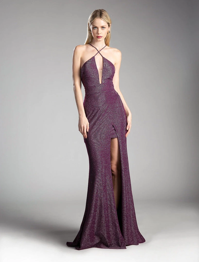 Make a statement in this long halter dress with side slit by Cinderella Divine CF279-2. Made out of metallic glitter, this evening gown features a ruched halter V-neck bodice with a sheer inset panel, cut out open back, floor length mermaid skirt with side slit and mini skirt inside, and a zipper closure.