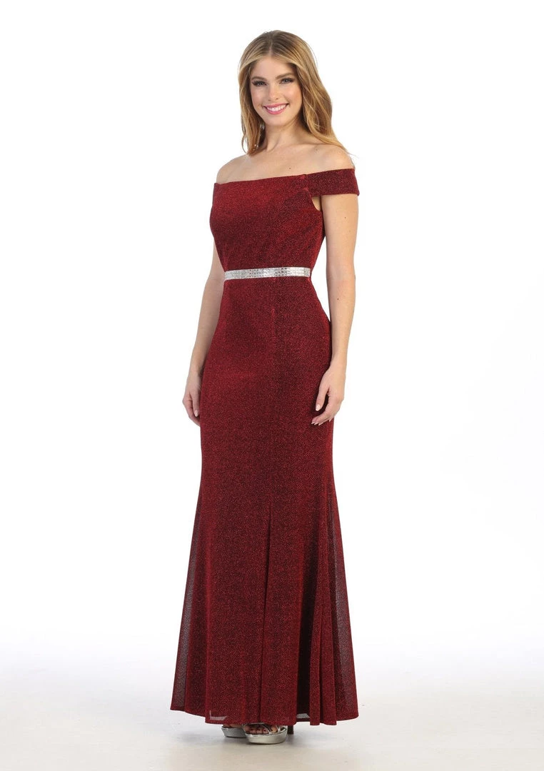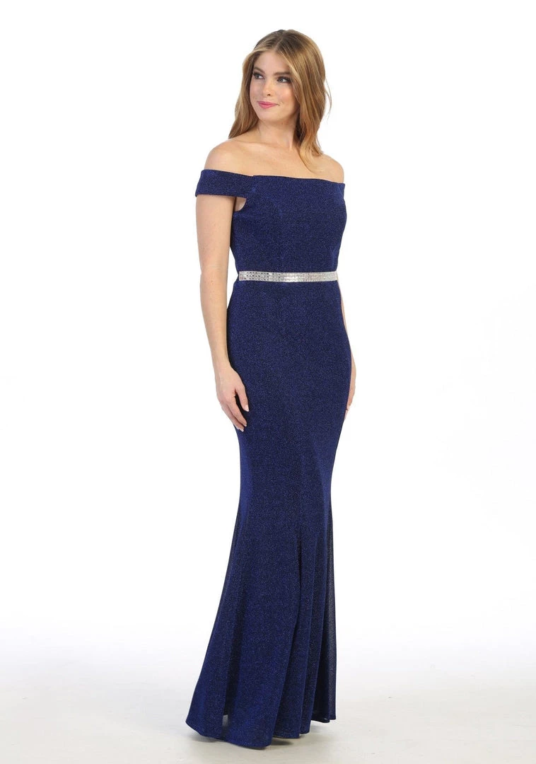 Look unforgettable in this off the shoulder metallic glitter mermaid dress by Celavie 6481. Glitter off-shoulder fit and flare gown with short sleeves, straight across neckline, and rhinestone embellishment. Affordably priced at $139, this long evening dress is perfect for any formal event and will keep you on budget!