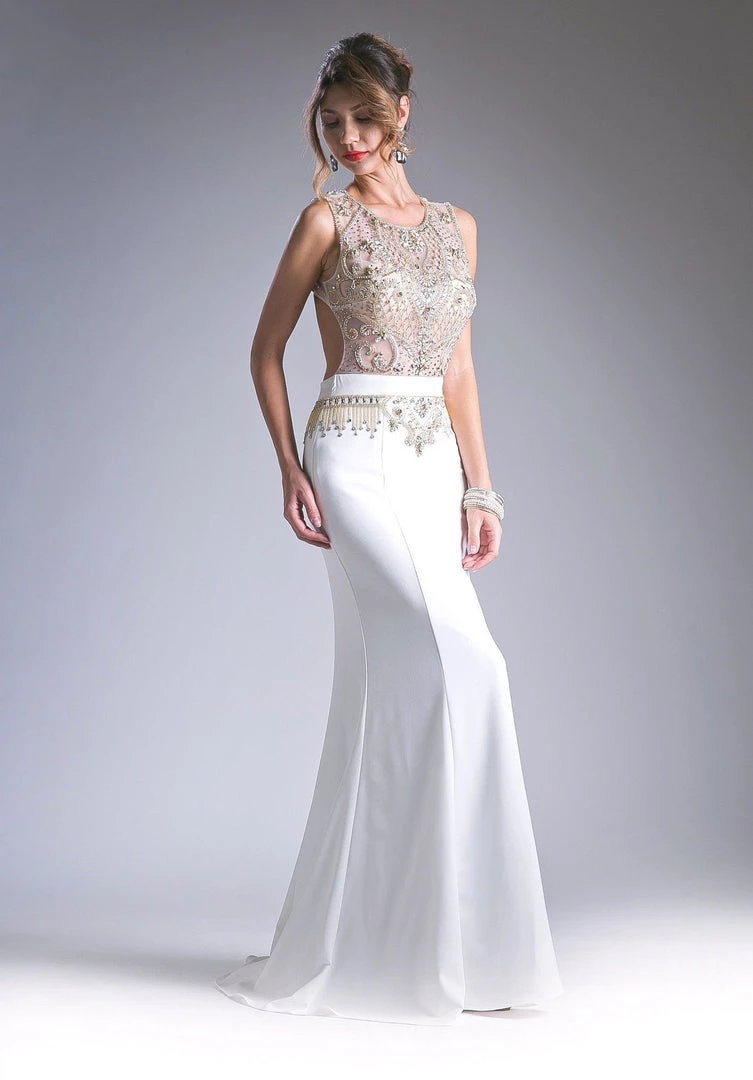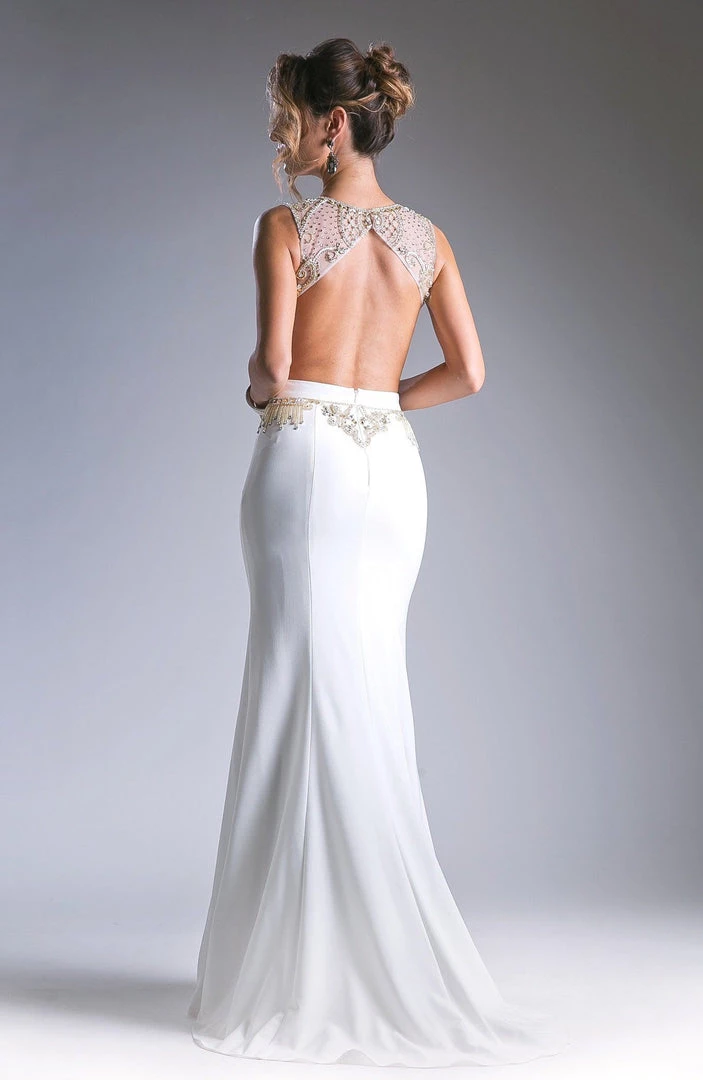 Turn heads in this beaded long open back cream dress by Cinderella Divine CJ232.