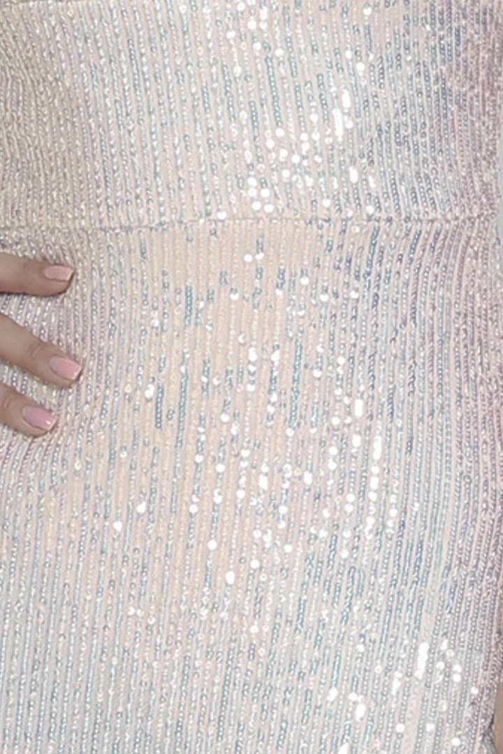Look breathtaking in this long multi-color sequin fitted dress with corset back by Poly USA 8720. This beautiful sequined gown features a sleeveless illusion V-neck bodice supported with spaghetti straps, flirty open back with crisscross ties, floor length form fitting skirt with a sweep train, side leg slit, and a lace-up back with zipper closure.