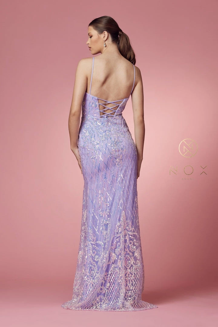 Be selfie ready in this long sequin sleeveless dress with fitted skirt by Nox Anabel S1041. This dress features an illusion deep v-neck with sequins from to bottom. This dress has a lace up back with adjustable ties and zipper closure with leg slit and sweep train.