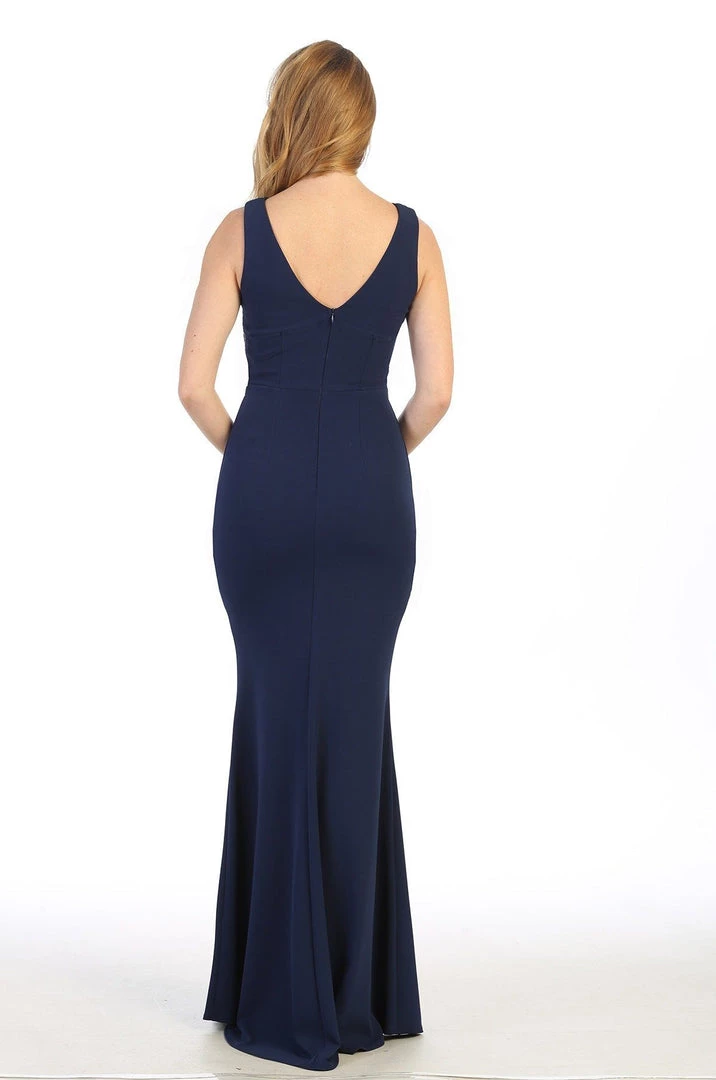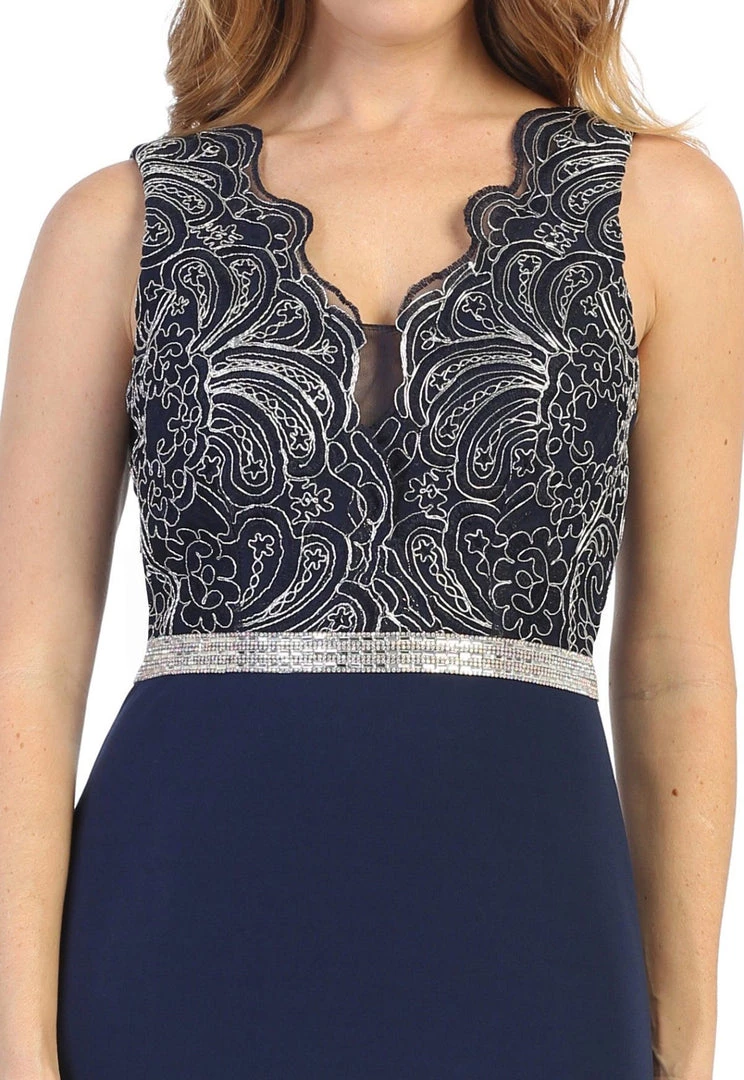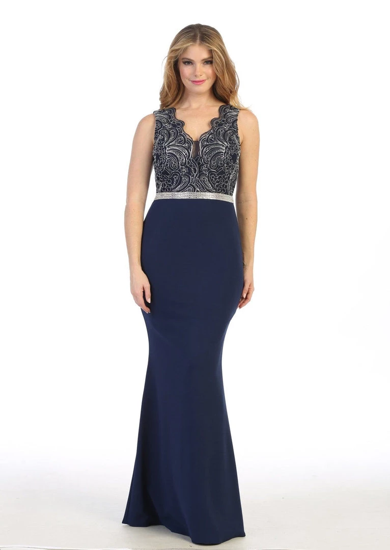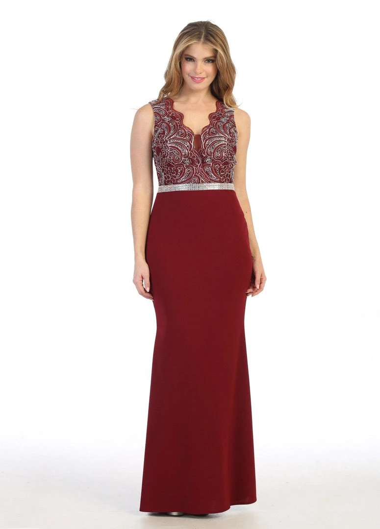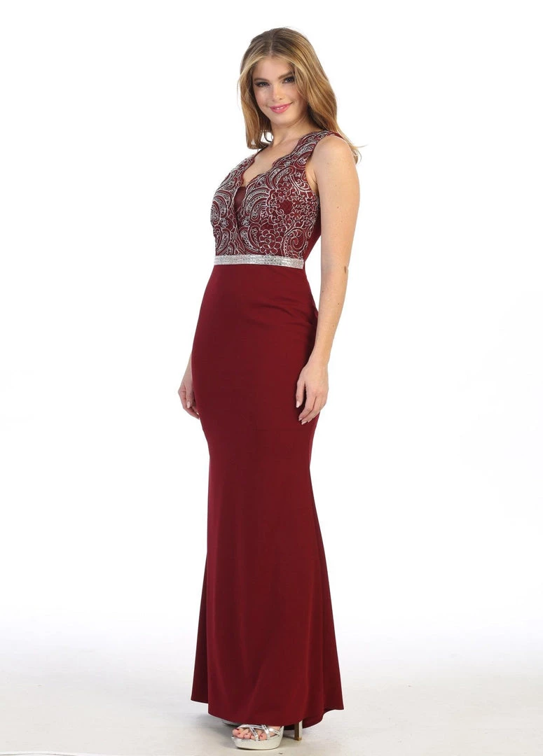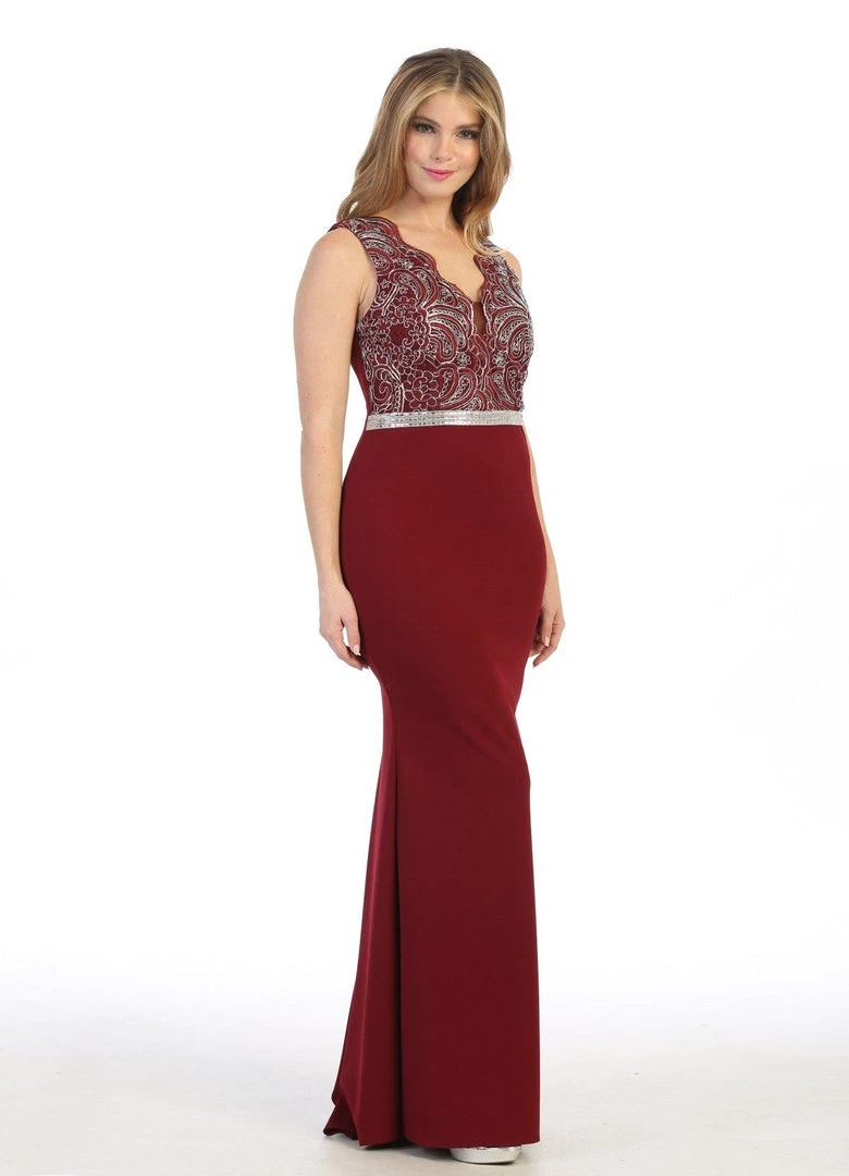 Look stunning in this long fitted sleeveless dress with embroidered bodice by Celavie 6446. This beautiful gown features an illusion V-neck sleeveless bodice, a sparkly beaded waistband, a partial open V-back, long floor length fitted mermaid skirt, and a zipper closure. Affordably priced below $150, this long evening dress is perfect for any formal event and will keep you on budget!