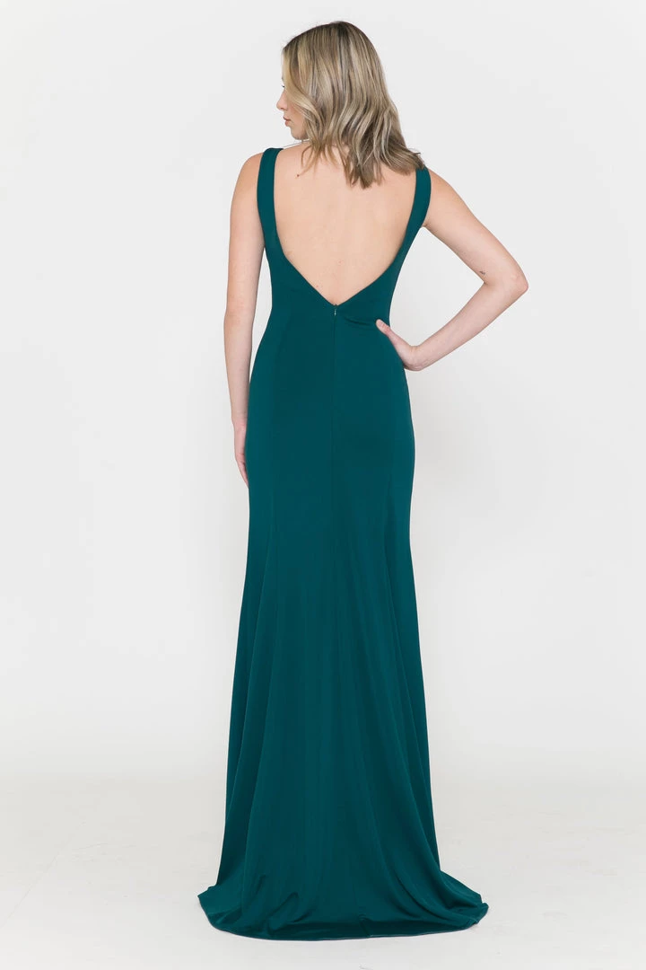 Feel beautiful in this long scoop neckline fitted dress with leg slit by Poly USA 8168. This beautiful gown features an scoop neckline, open back, floor length form fitting skirt with a sweep train, side leg slit, and a zipper closure.