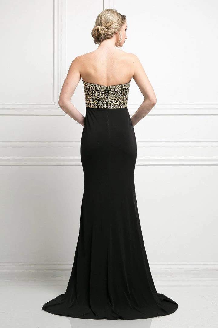 Make a grand entrance in this long strapless fitted dress with beaded bodice by Cinderella Divine CD488.