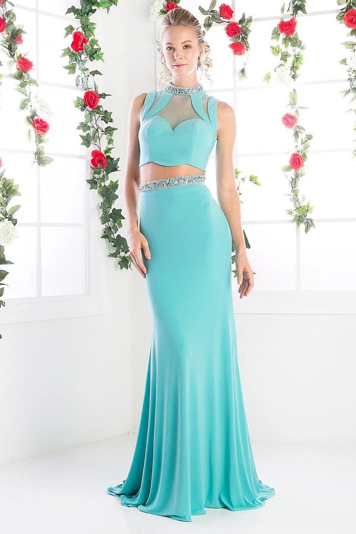 Captivate the room in this beaded long illusion sleeveless crop top dress with fitted skirt by Cinderella Divine CK20.