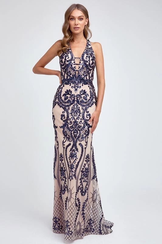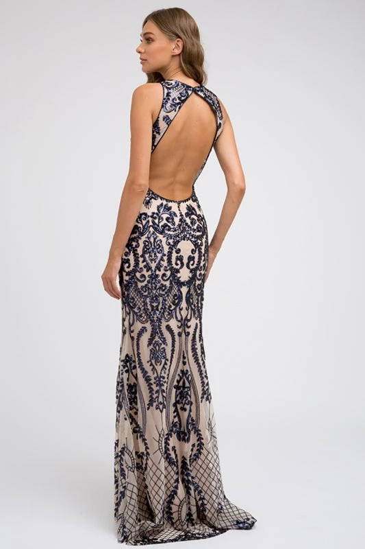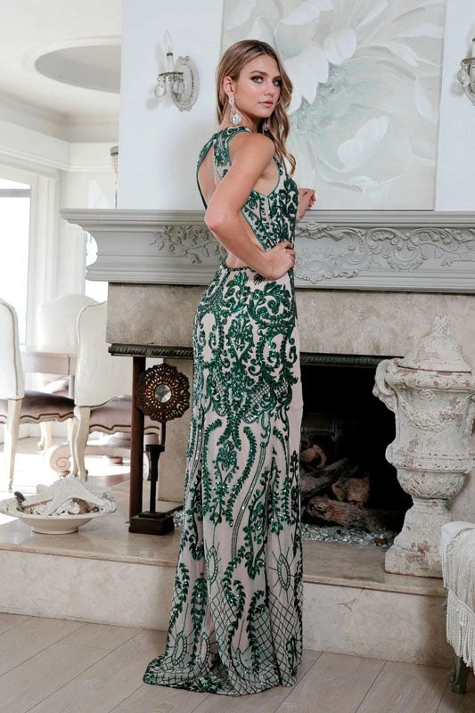 Dazzle the room in this long sequined bodice sleeveless dress with mermaid skirt by Juliet 243. Adorned from top to bottom with handstitched intricate sequins, this dress comes with a v-neckline with open back and zipper closure. This dress will surely turn heads!