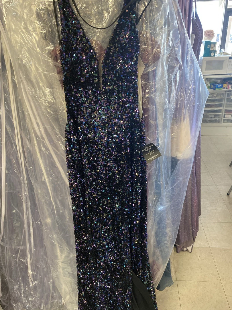 Show off your sexy side in this long fitted sequin dress with side slit by Cinderella Divine CF318.
