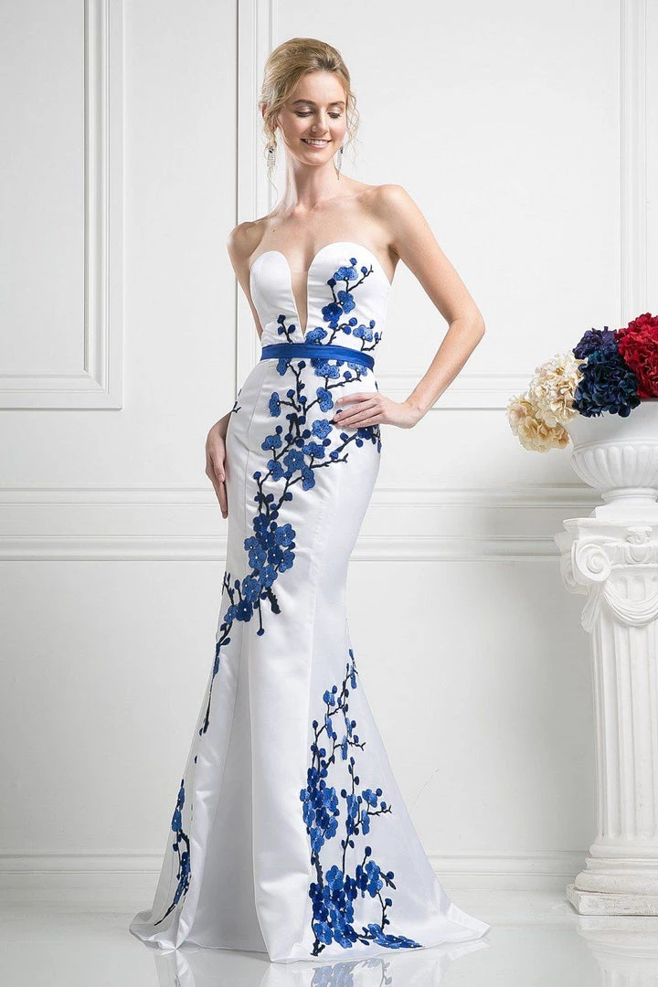 Look unforgettable in this floral embroidered long strapless mermaid dress by Cinderella Divine KD052.