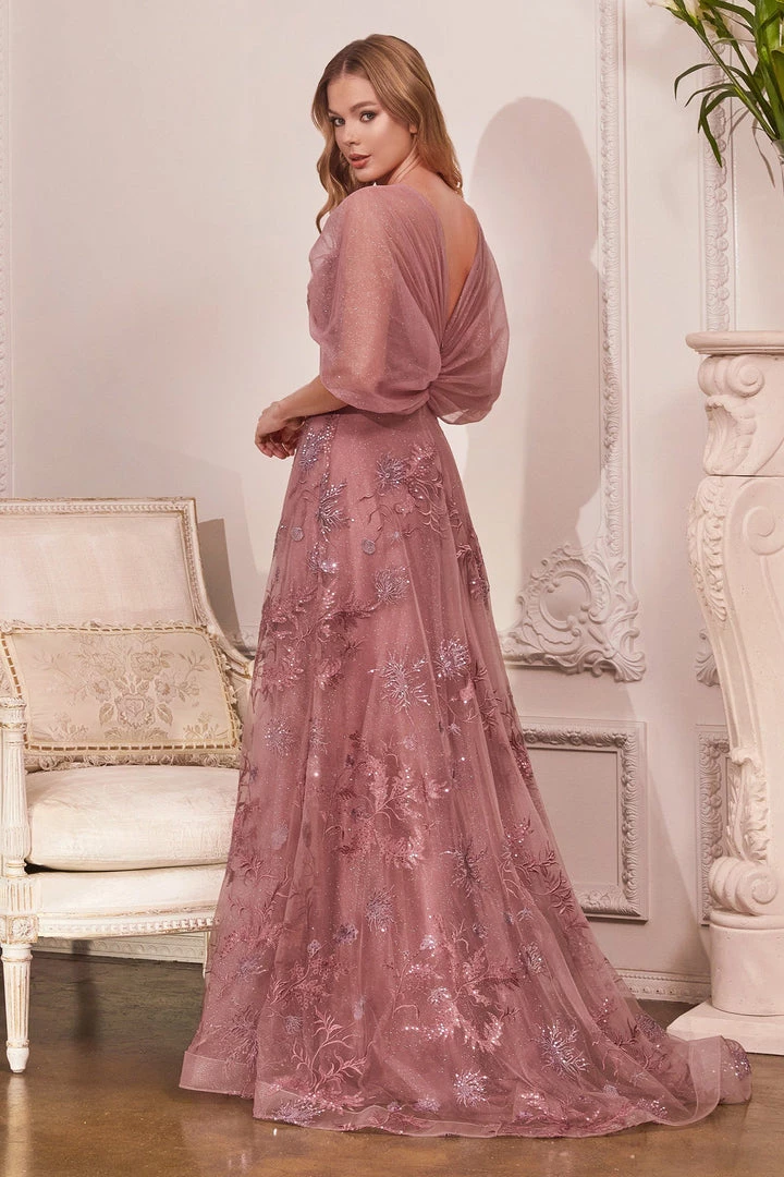 You’ll love twirling around in this floral applique long off the shoulder dress with A-line tulle skirt by Cinderella Divine OC008. Layered glitter tulle ball gown with draped off the shoulder sleeves and floral appliques. Sweetheart neckline and center back zipper complete this gorgeous look.