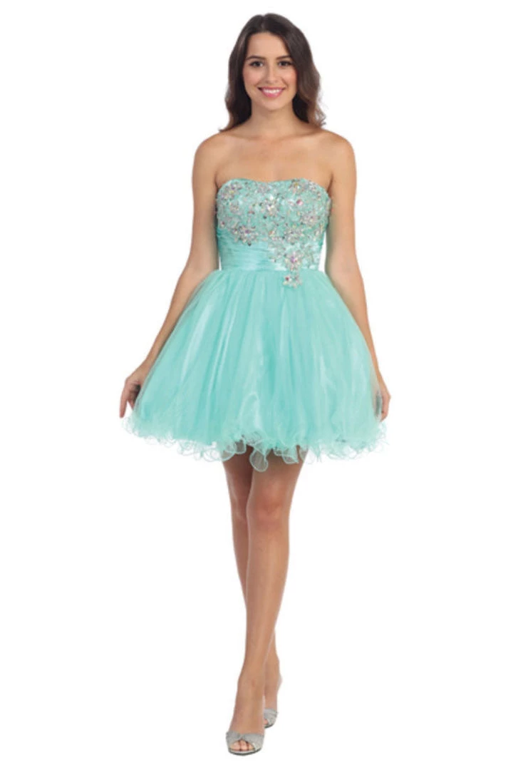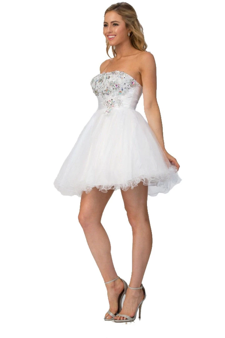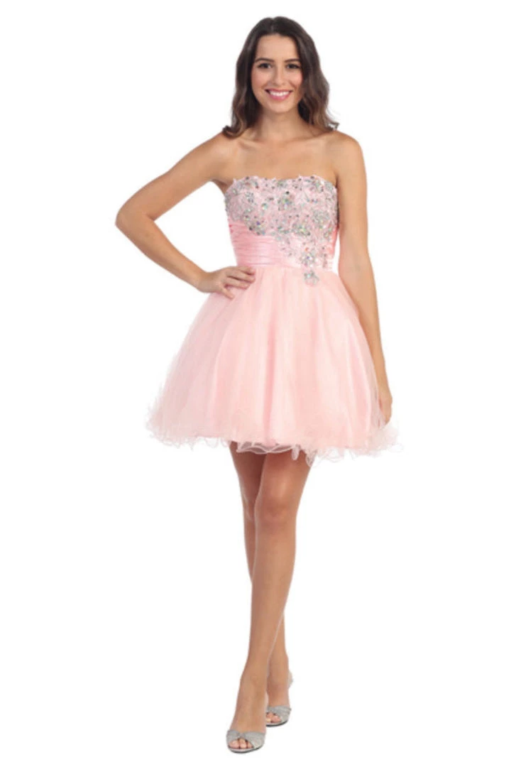 Captivate the room in this floral applique strapless cocktail dress with corset back by Star Box 587. This beautiful short dress features a straight across strapless bodice adorned with beaded floral appliques, ruched satin sash, poofy short ruffled skirt with a curly hemline, and a lace-up corset back with zipper closure. Affordably priced at $159, this short party dress is perfect for any formal event and will keep you on budget!