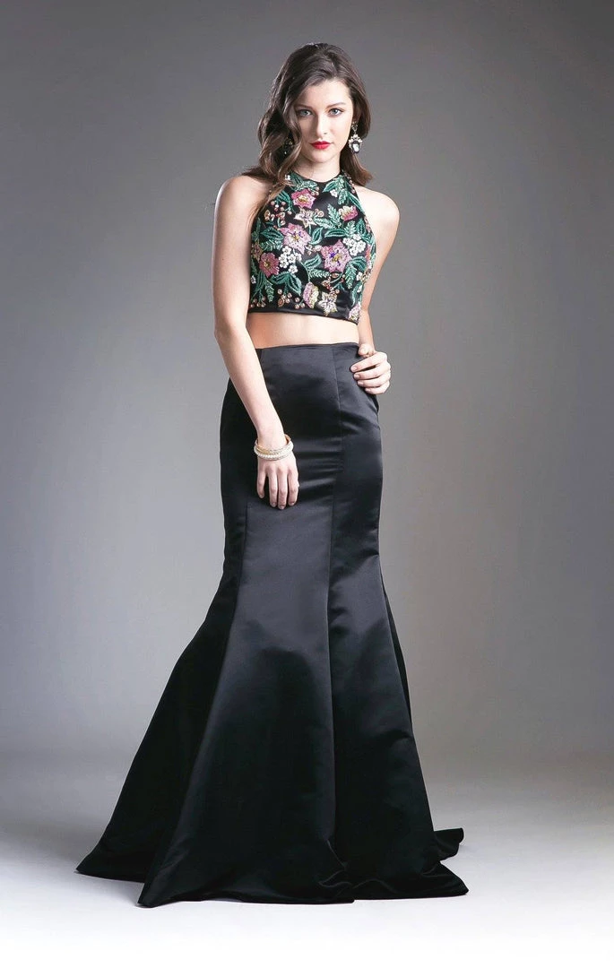 Fall in love with this floral embroidered long two piece black mermaid dress by Cinderella Divine 83699.