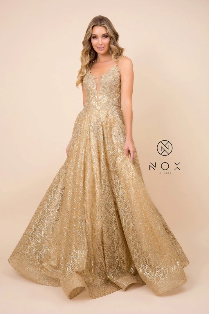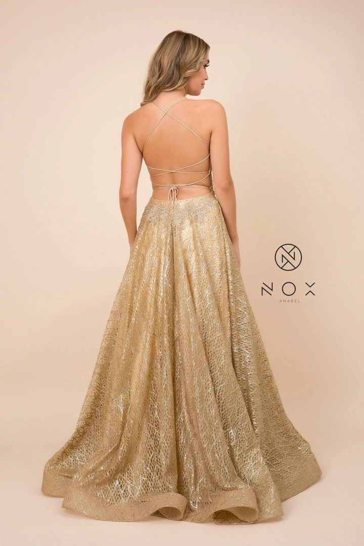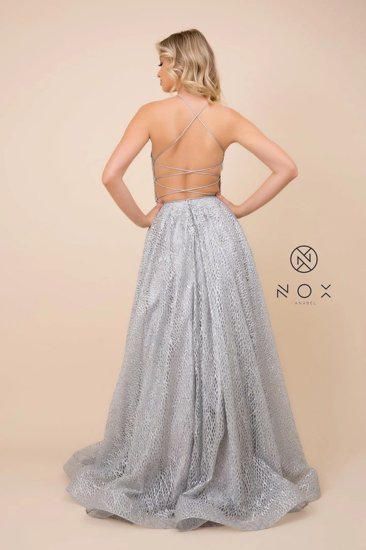 Show off your fashion sense in this long A-line glitter mesh dress with corset back by Nox Anabel R349.