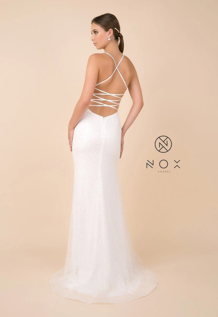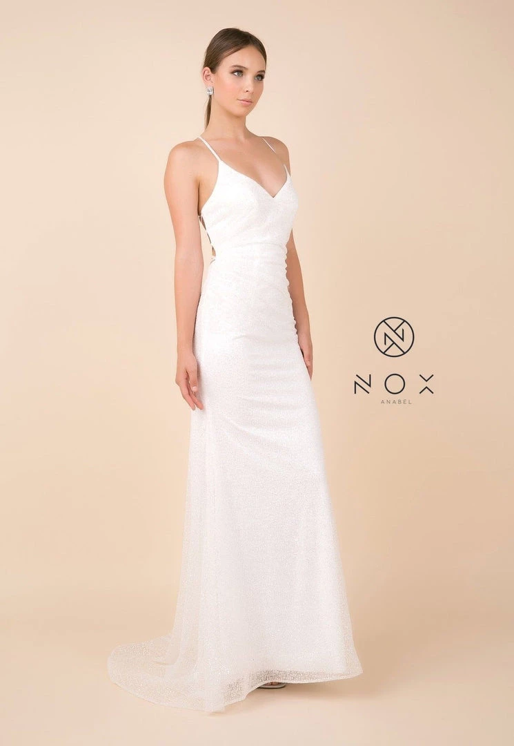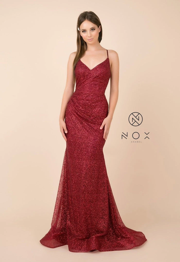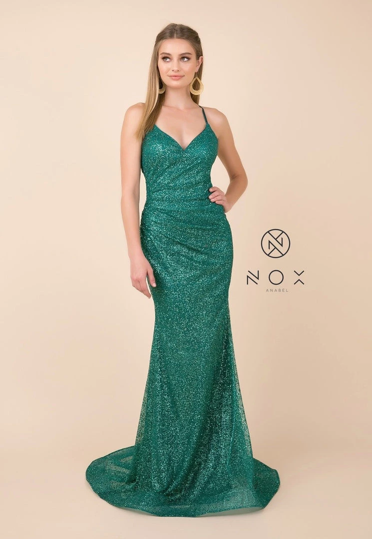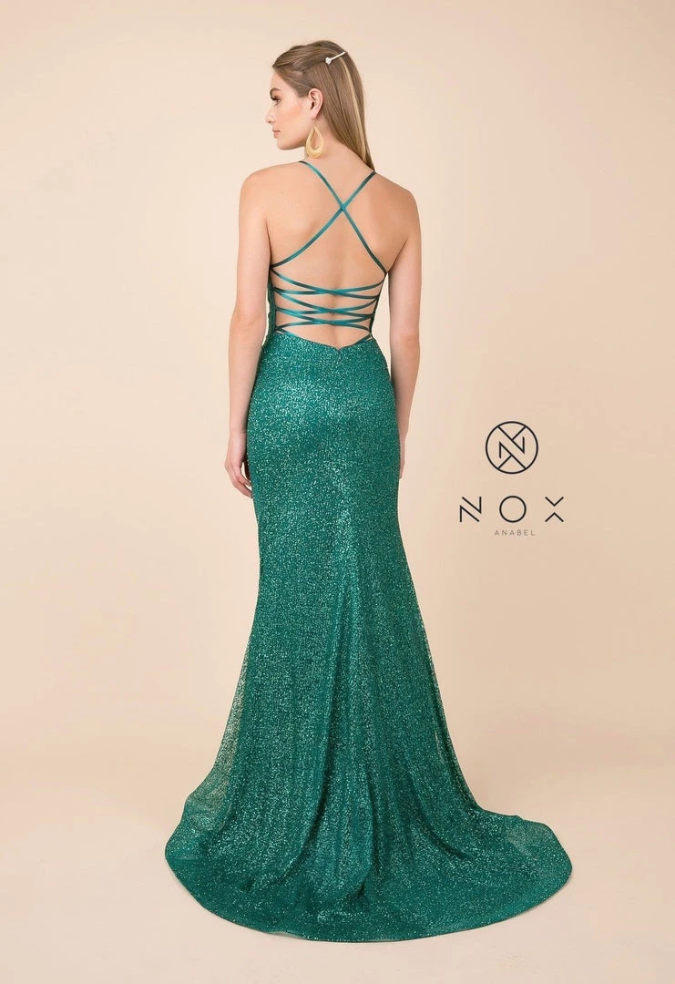 Make your night sparkle in this long sleeveless V-neck mermaid glitter dress with sweep train by Nox Anabel T290.