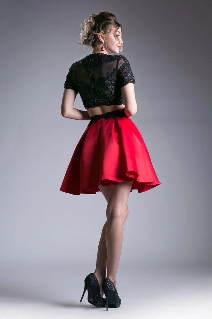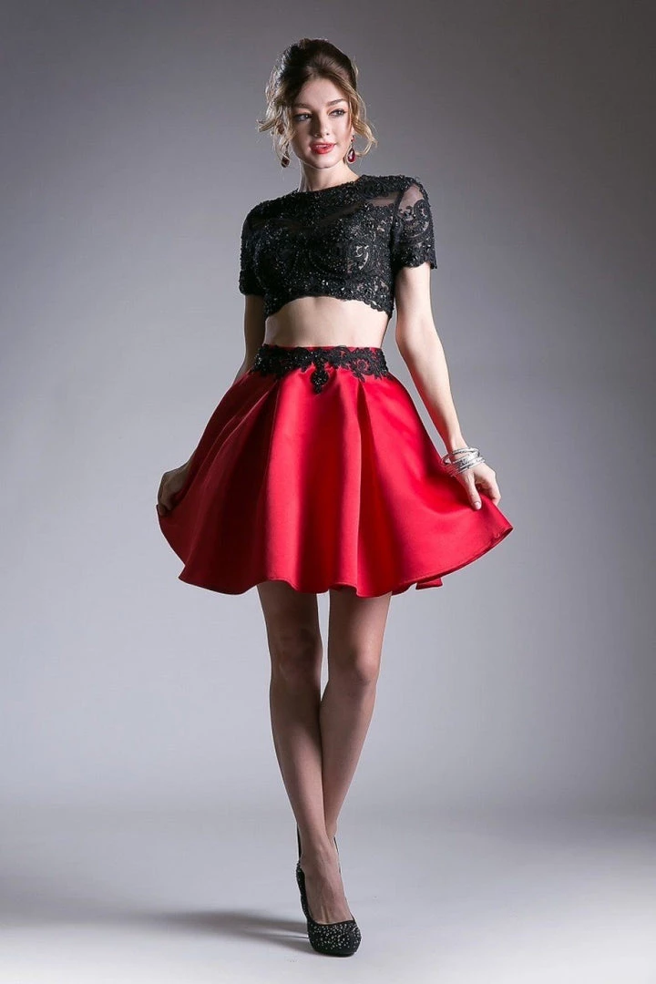 Look radiant in this black and red short two piece dress by Cinderella Divine CR747S. This red carpet inspired cocktail dress features shimmery beading crowned the neckline, the sleeves, and the bodice. Dramatic short A-line skirt adds elegance to the style.