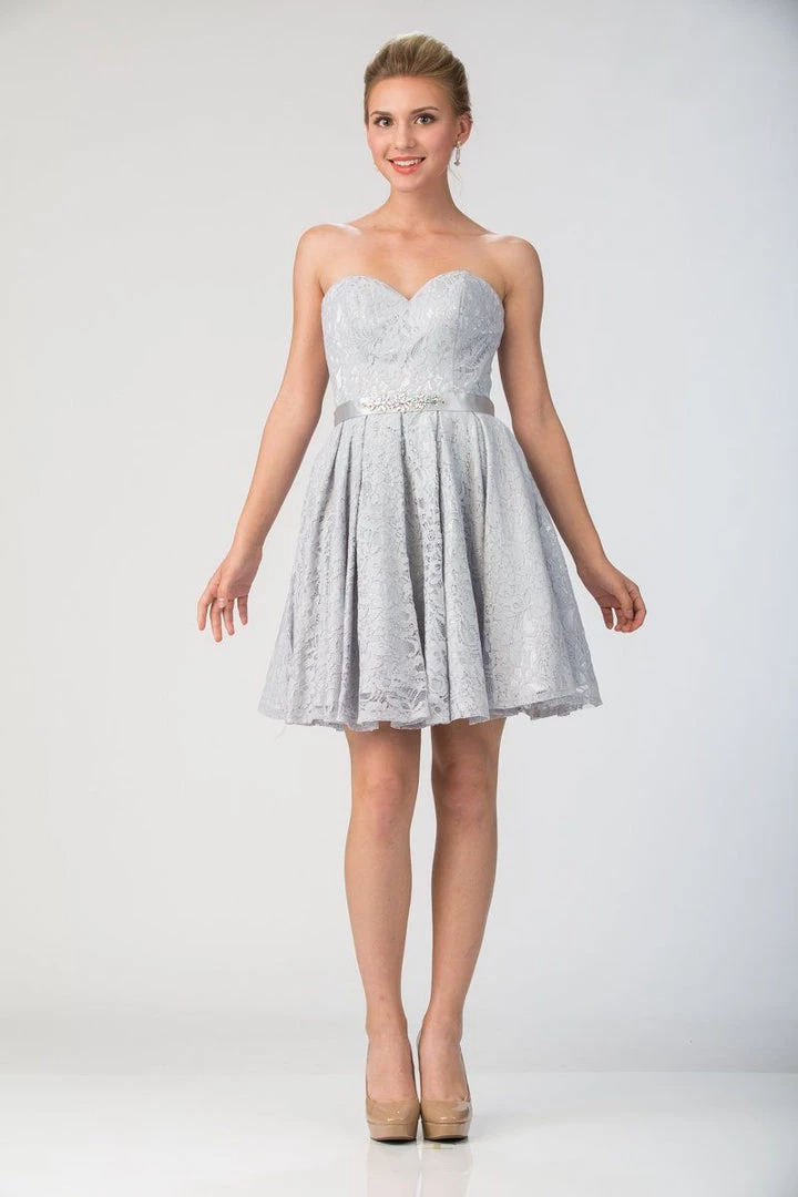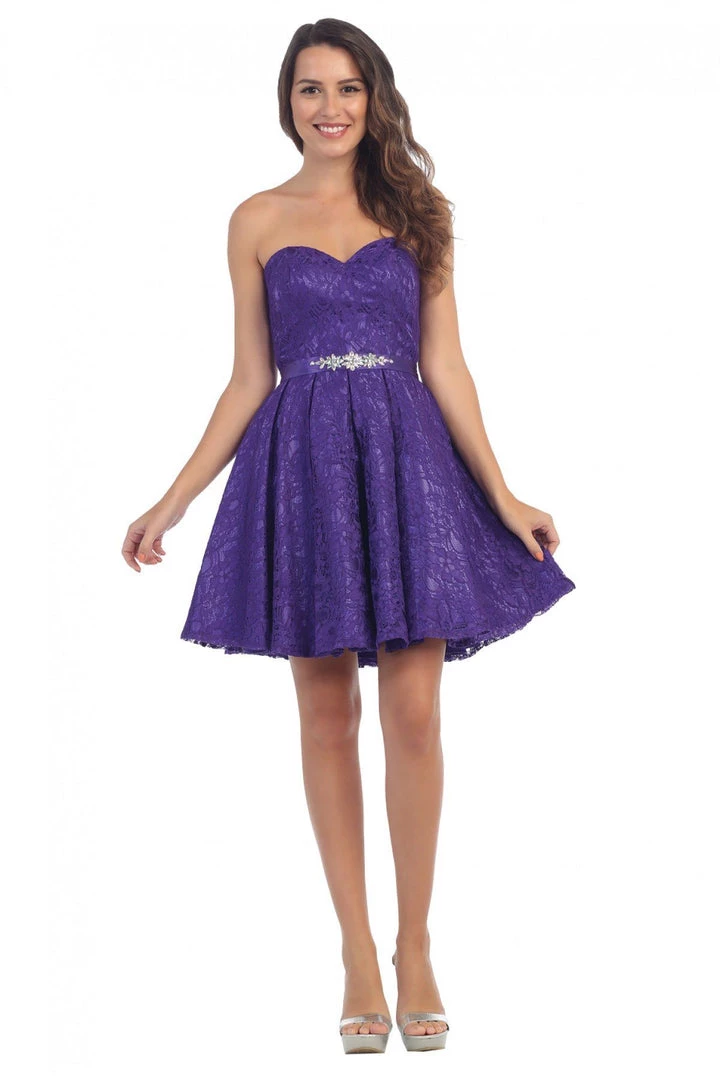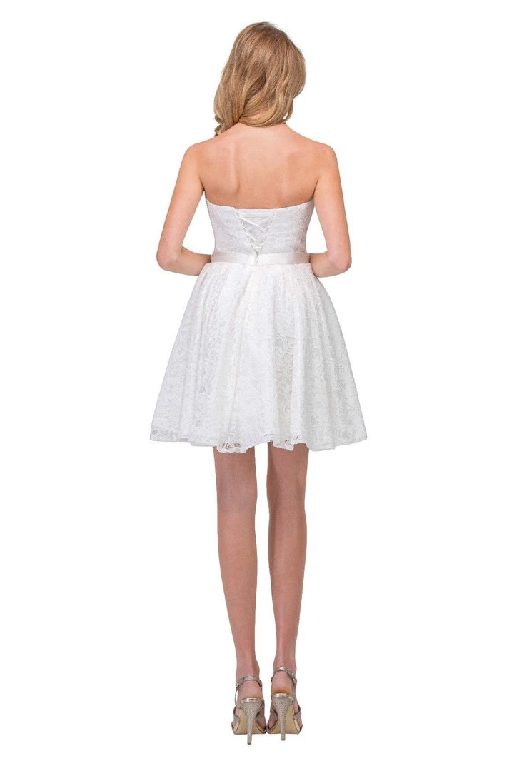 Look unforgettable in this strapless sweetheart lace cocktail dress with corset back by Star Box 6147. Made out of lovely lace, this beautiful short dress features a strapless sweetheart neckline, satin sash adorned with sparkly beaded details, short A-line skirt, and a lace-up corset back with zipper closure. Affordably priced under $140, this short party dress is perfect for any formal event and will keep you on budget!