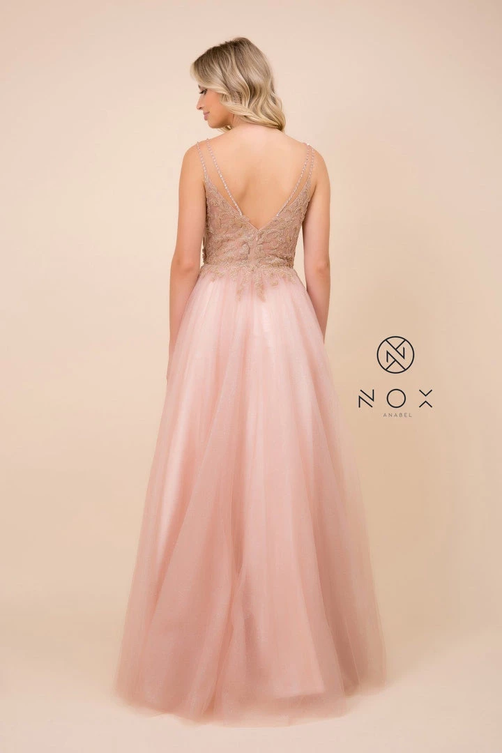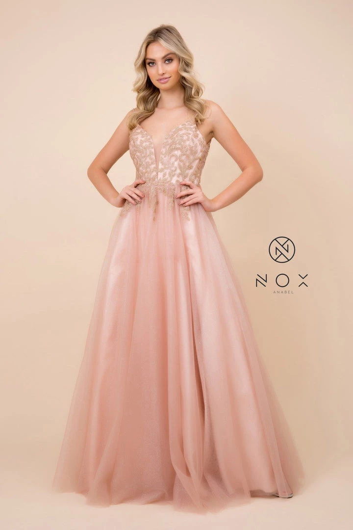 Show off your fashion sense in this long A-line glitter tulle dress with embroidered bodice by Nox Anabel T407.