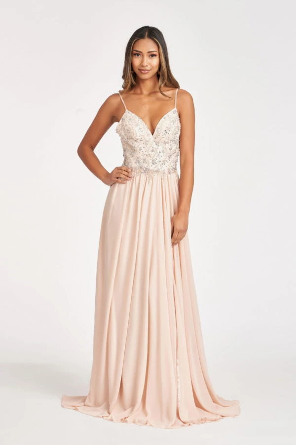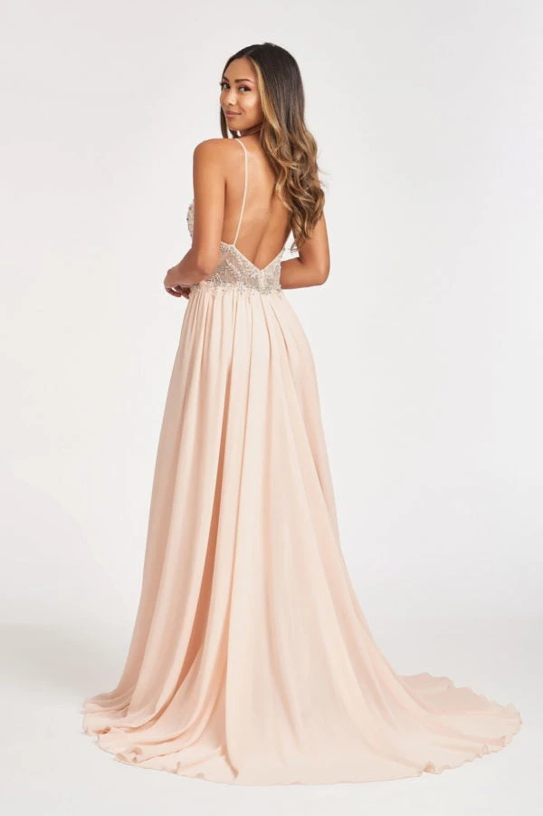 Be camera ready in this long chiffon V-neck dress with A-line slit skirt Elizabeth K GL3005.