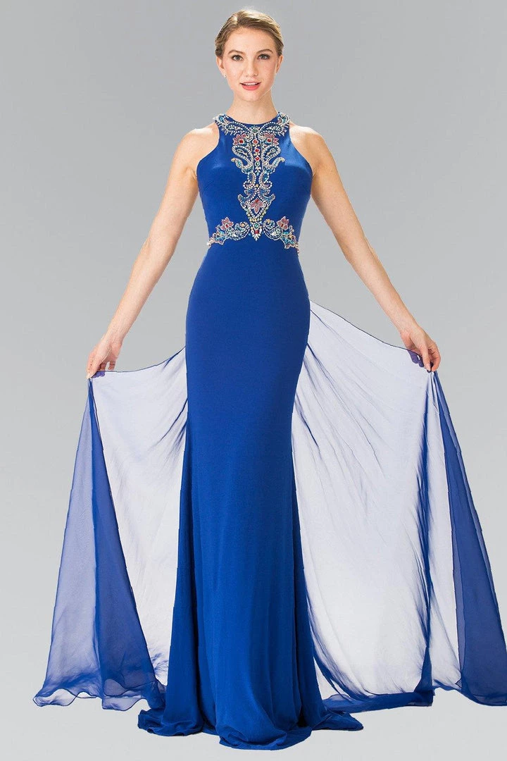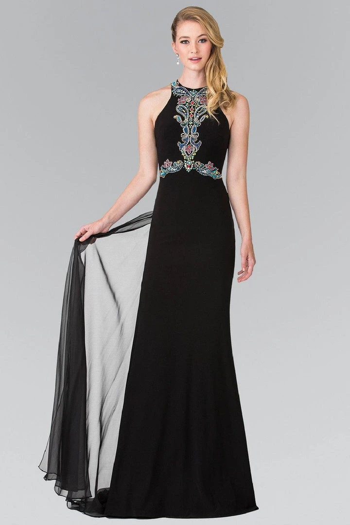 Be a trendsetter in this long beaded chiffon halter dress with train by Elizabeth K. Made out of chiffon, this beautiful gown features a colorful beaded design, a small train, and a sheer back.