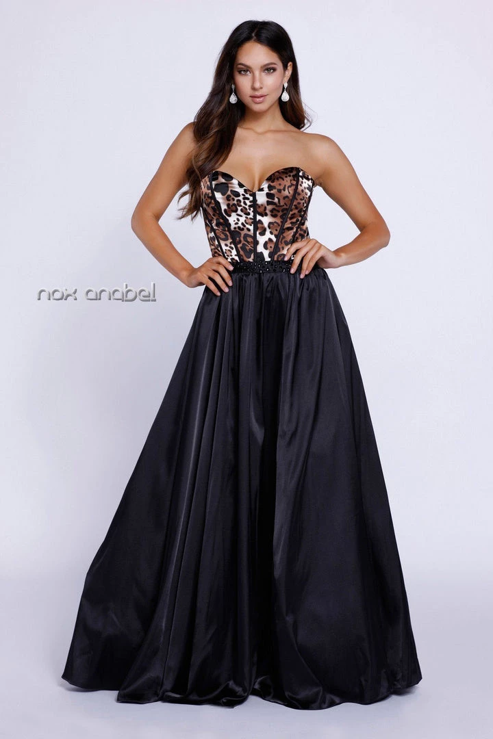 Look fierce and chic in this leopard print strapless dress with long black skirt by Nox Anabel 8230. This long evening gown features a sweetheart strapless bodice with beautiful leopard print, beaded waistband, floor length A-line skirt that elegantly moves, and a lace-up corset open back.