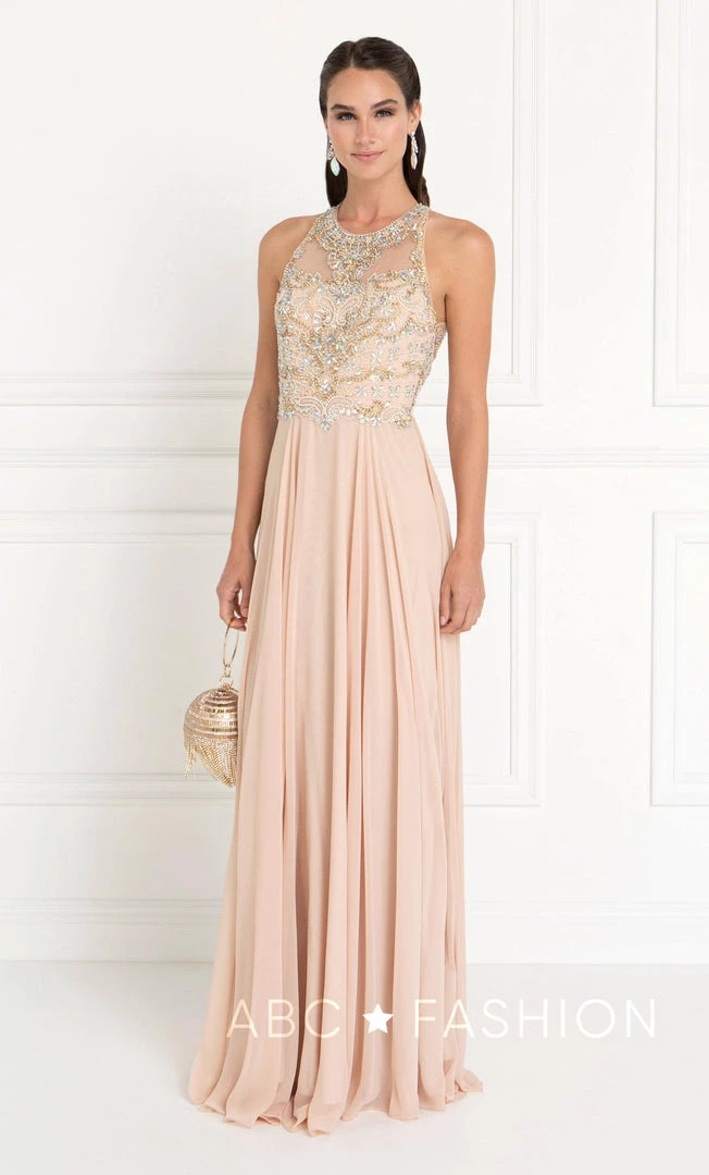 Dazzle the room in this bead embellished bodice champagne gown by Elizabeth K GL1564. Sleeveless chiffon full length dress with an illusion sweetheart neckline on a A-line silhouette. Has a back cut-out with a zipper close and full beading/jeweled details. Perfect for any formal event!