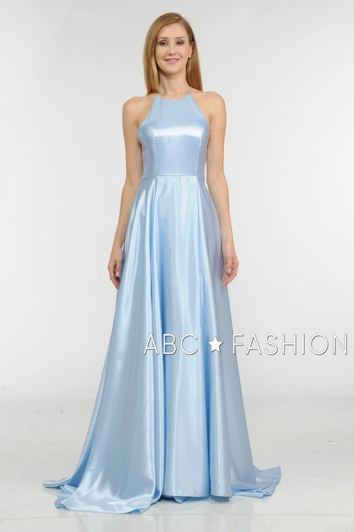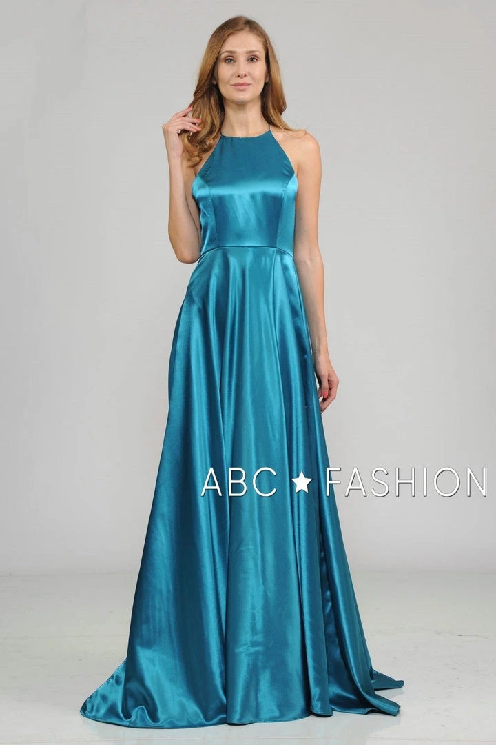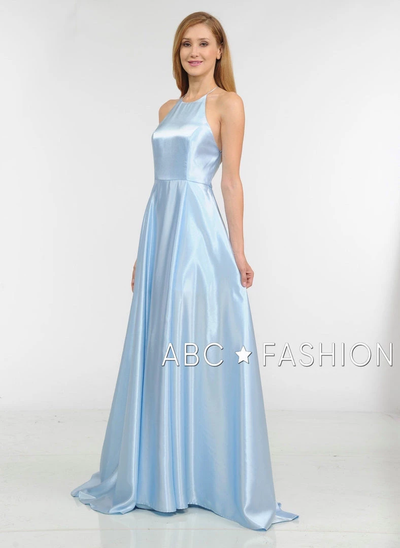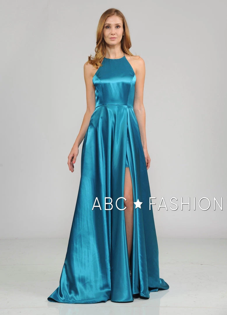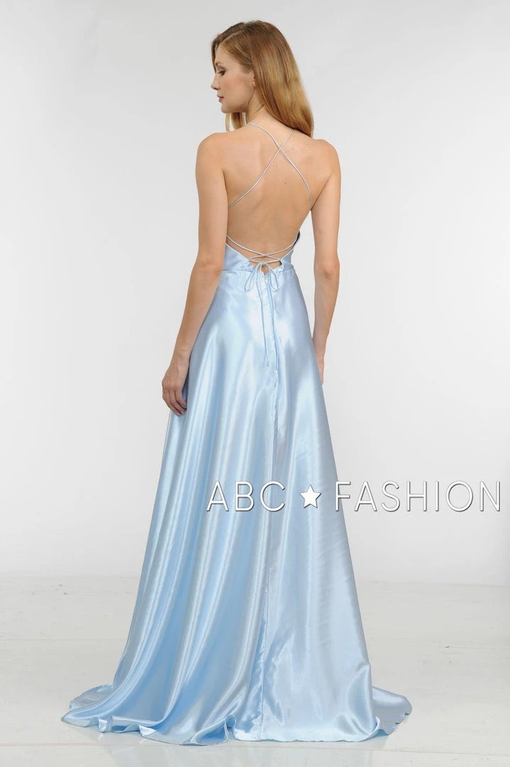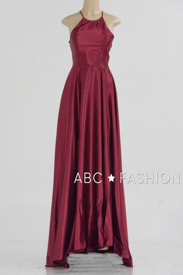 Be the center of attention in this charmeuse gown with strappy open back by Poly USA 8250. Beautiful and elegant charmeuse long dress with a sexy high front slit, spaghetti shoulder straps, flirty open back, and a zipper closure. Affordably priced under $140, this dress is perfect for any formal event and will keep you on budget!