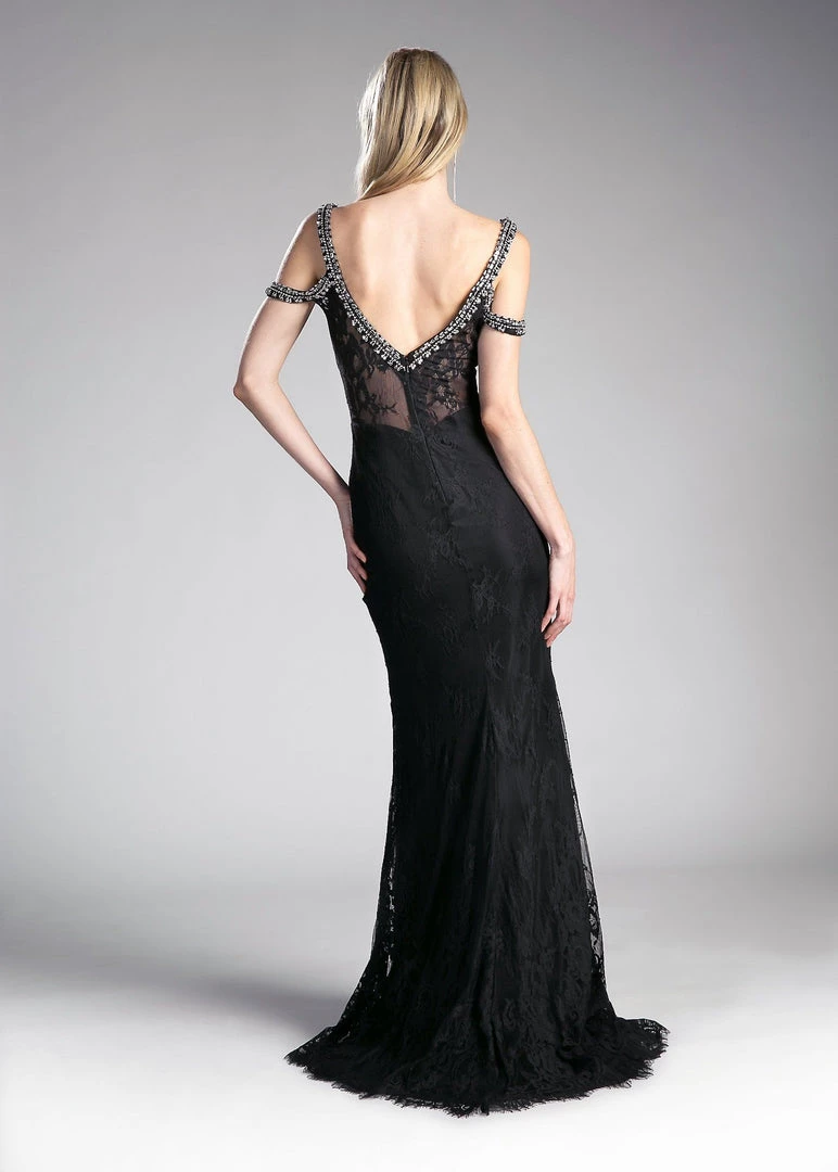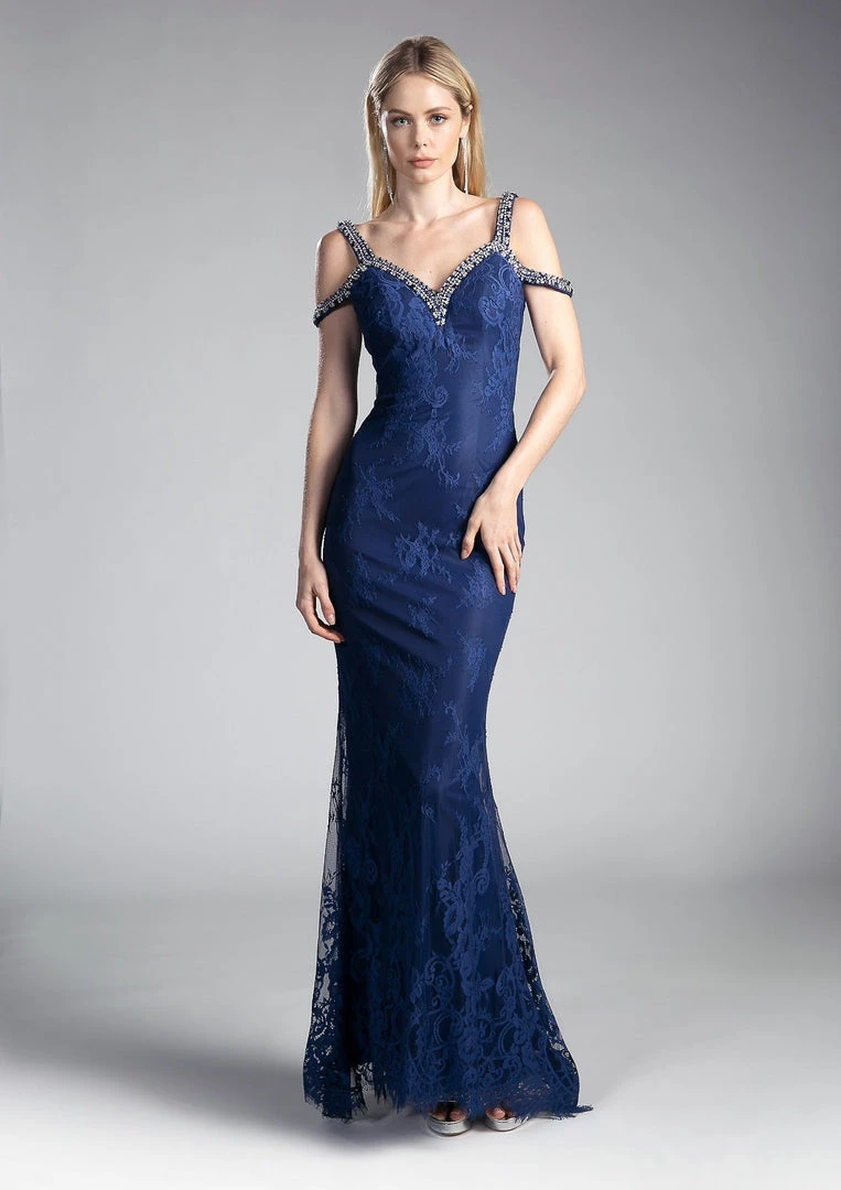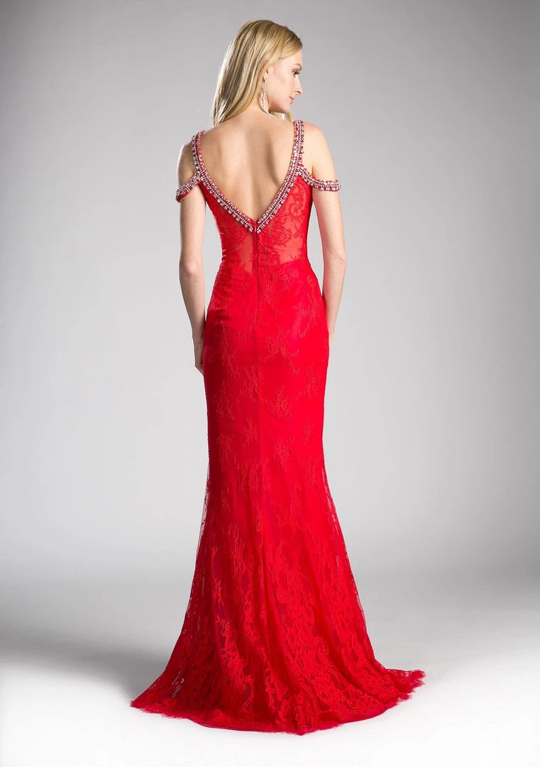 Captivate the room in this long cold shoulder fitted lace dress with open back by Cinderella Divine 13112A. This lace evening gown features a sweetheart cold shoulder bodice with sparkly rhinestone beaded straps, open V-back with flirty sheer lace, a floor length form fitting skirt, and a zipper closure.