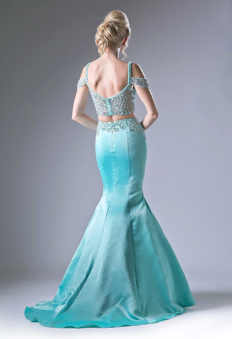 Look unforgettable in this long cold shoulder two piece mermaid dress by Cinderella Divine P209.