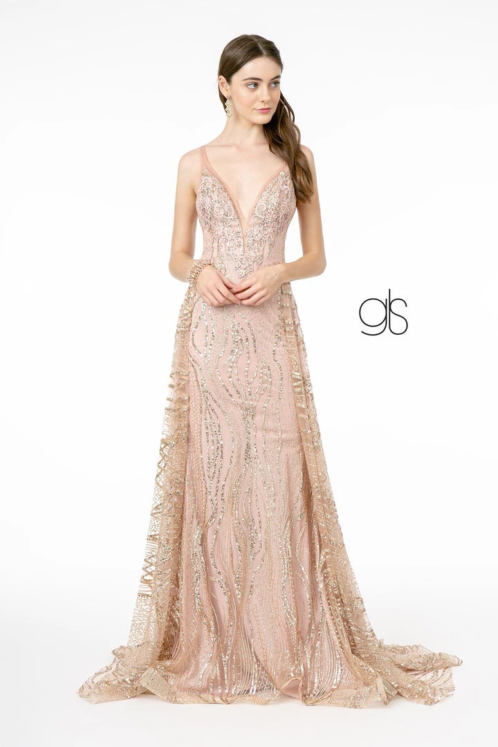 Make a statement in this glitter print long sleeveless plunging V-neck dress with A-line skirt by Elizabeth K GL2955. Affordably priced at $280, this gown is perfect for any formal event and will keep you on budget!